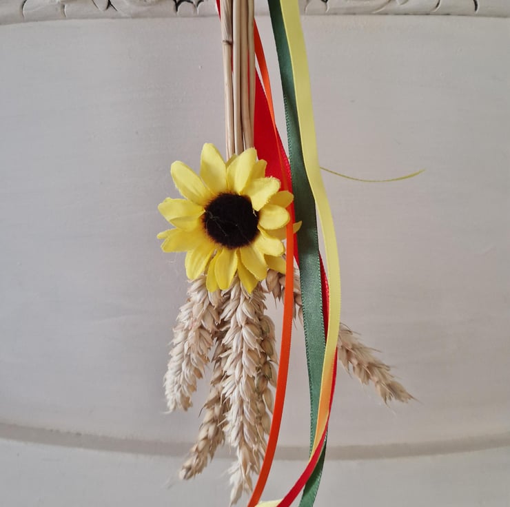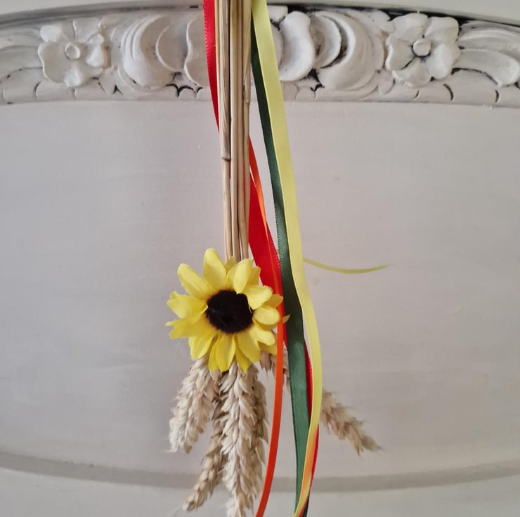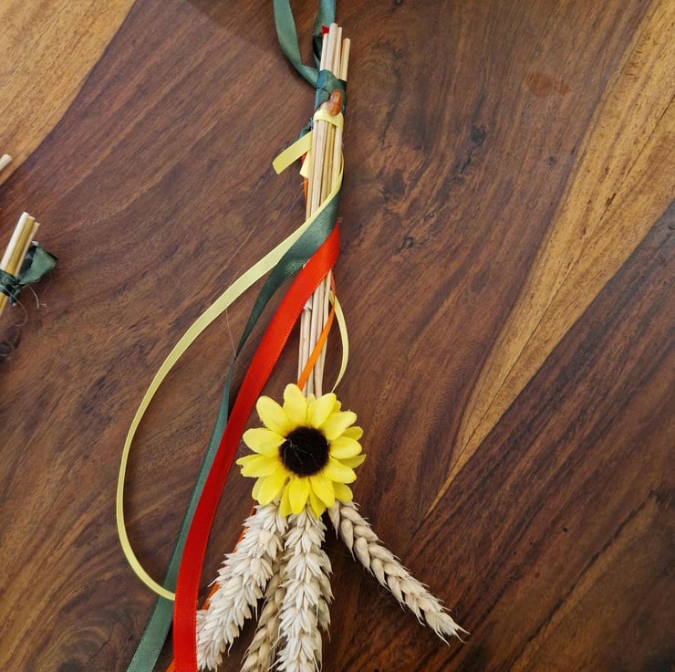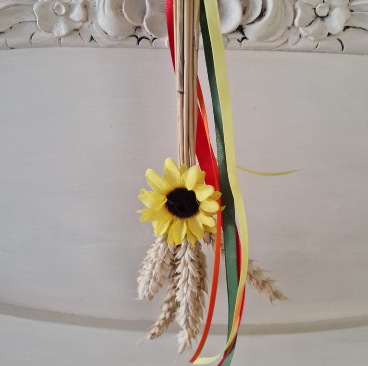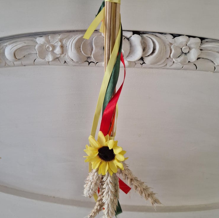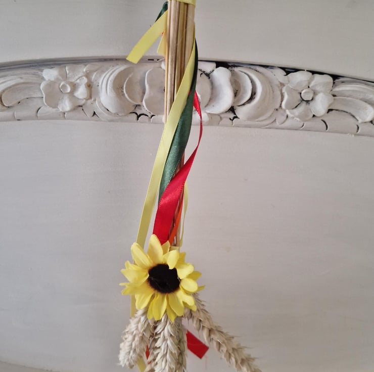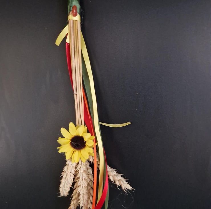 Adorned with ribbons in traditional Lughnasadh colors, this broom embodies the essence of the festival:
