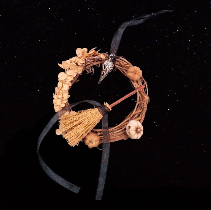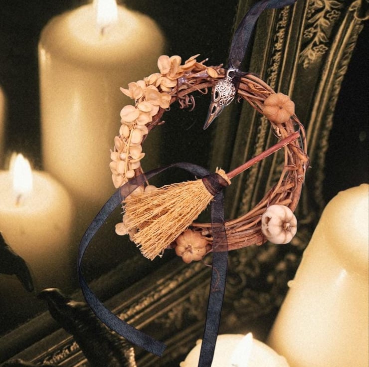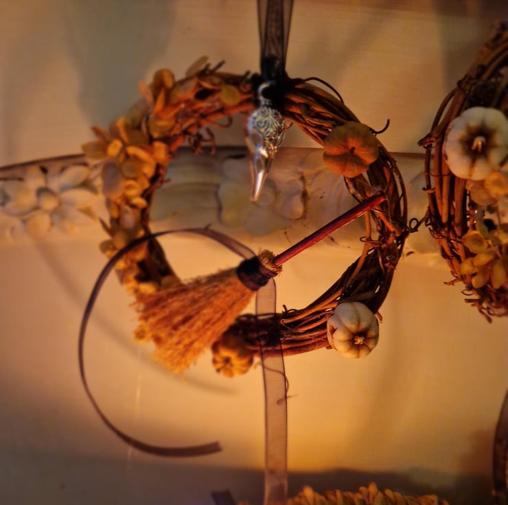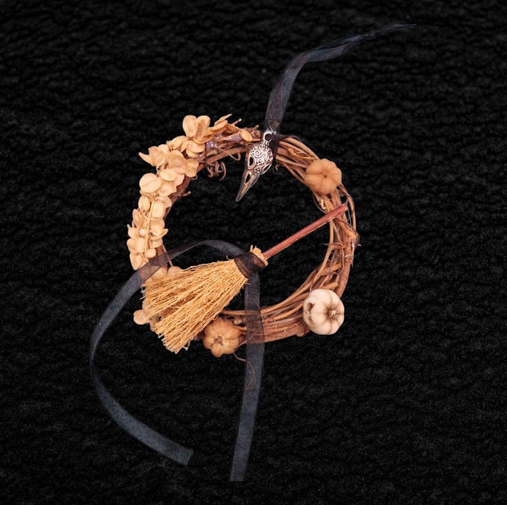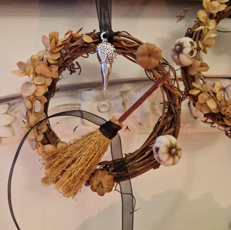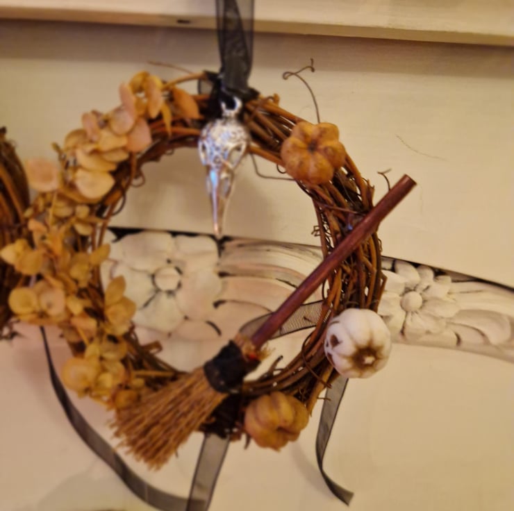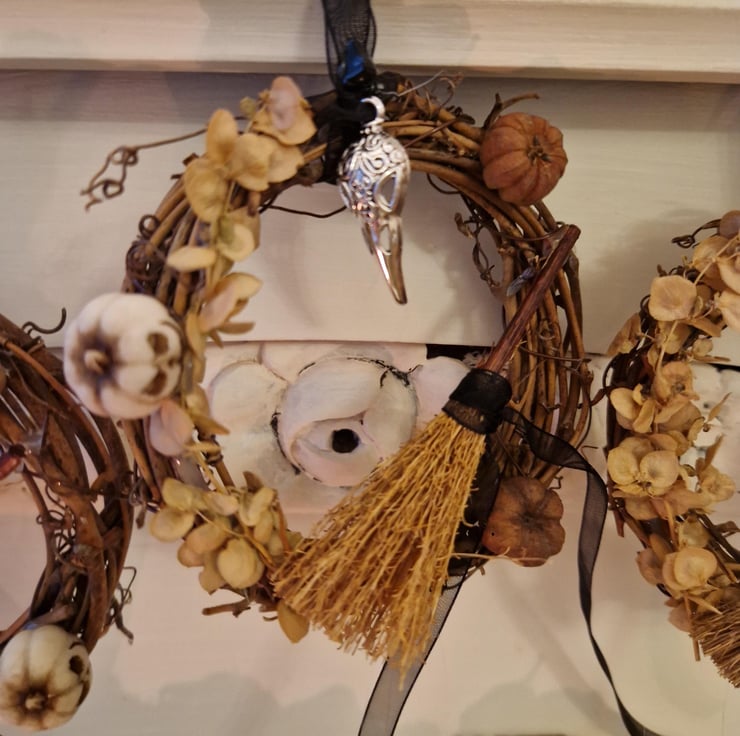 A miniature wreath to celebrate Samhain decorated with symbols of the season