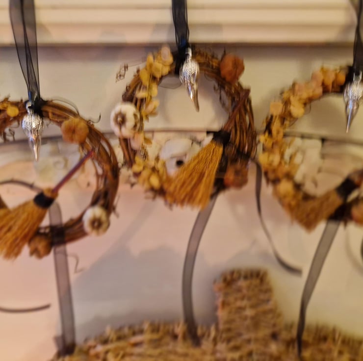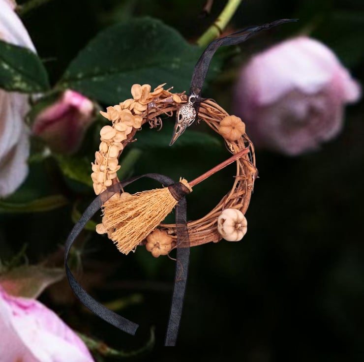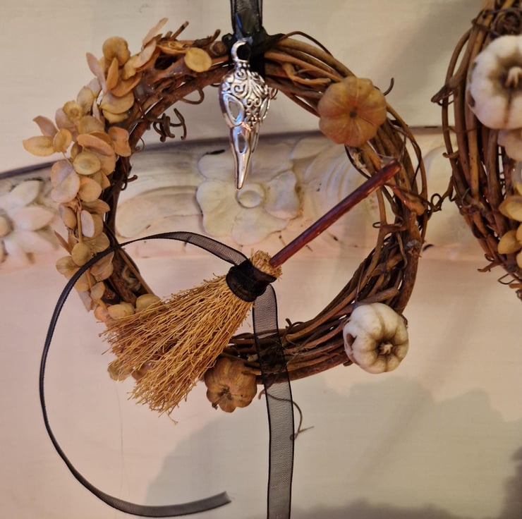 Embrace the thinning veil and honour your ancestors with this unique Samhain Spirit Wreath. Handcrafted with deep intention, this mini wreath is a profound statement piece for your altar, door, or sacred space, perfectly embodying the essence of the season.
