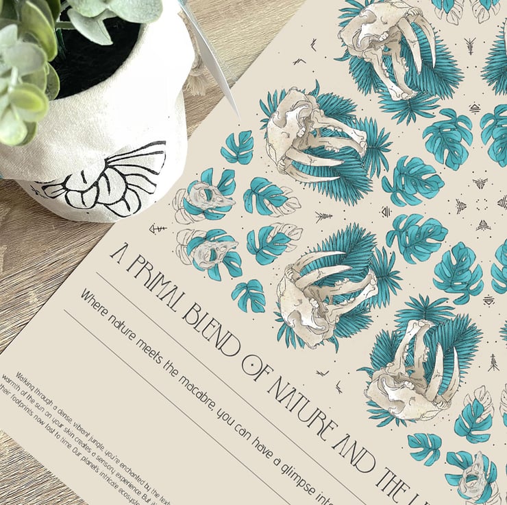A pattern within a pattern forms this intricate kaleidoscope of leaves and animal fossils. For the house plant lovers with a dark side. To add a true badass touch of tropical haven in teal to your home decor, here you'll find all kinds of oddities and curiosities too soothe your chase for Out of the Ordinary designs. A piece of botanical illustration to gift the fans of Natural History and skulls. The title and short paragraph reads: