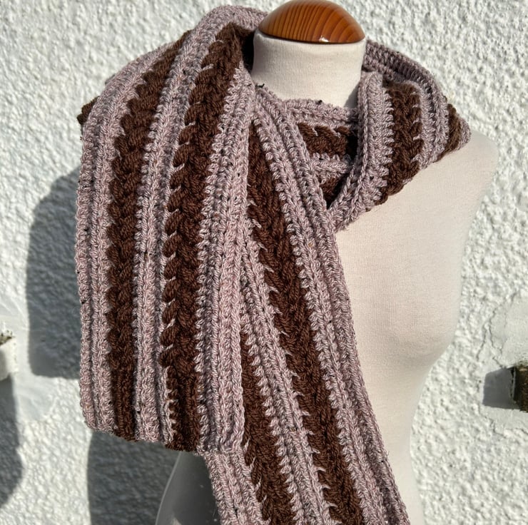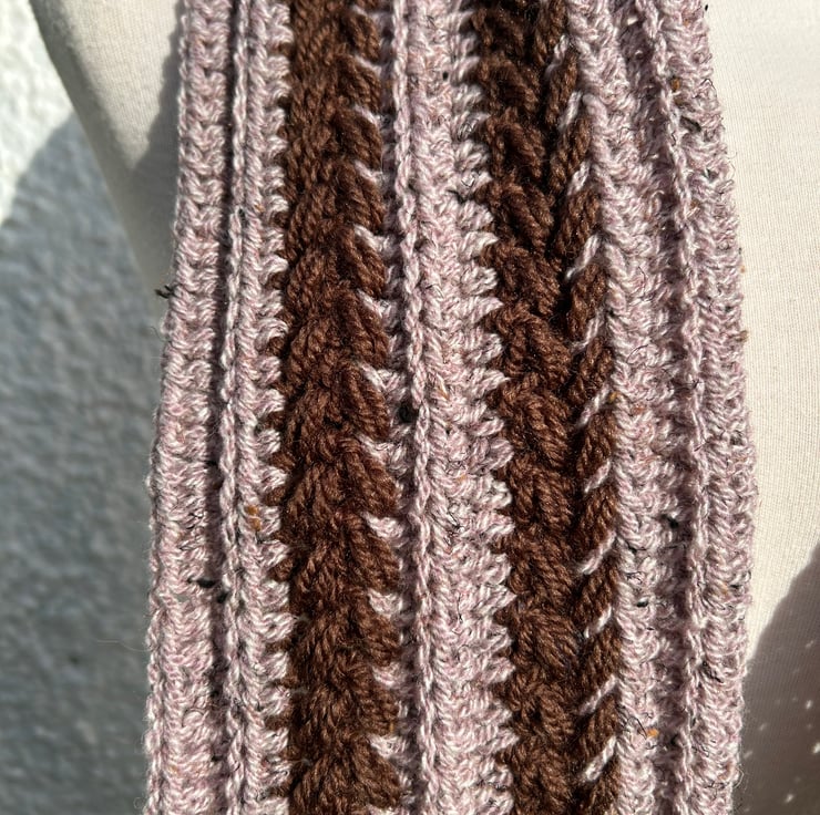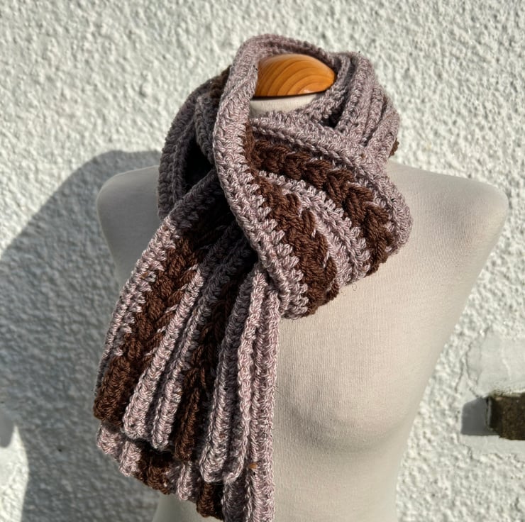 This scarf is made with the left over yarn from recent bigger projects. One is solid dark brown while the other is haze mid brown included yarn. Both yarns contain about 20% of wool