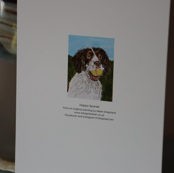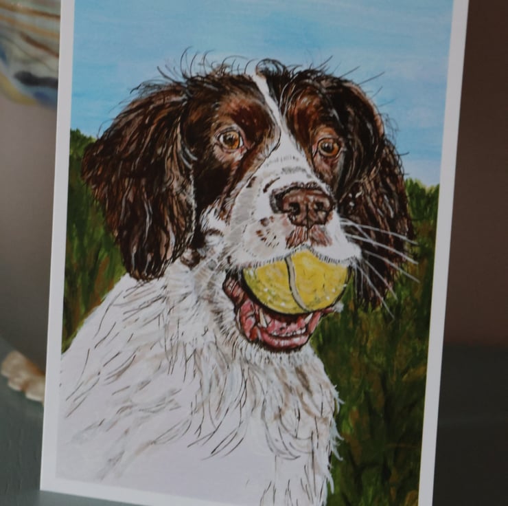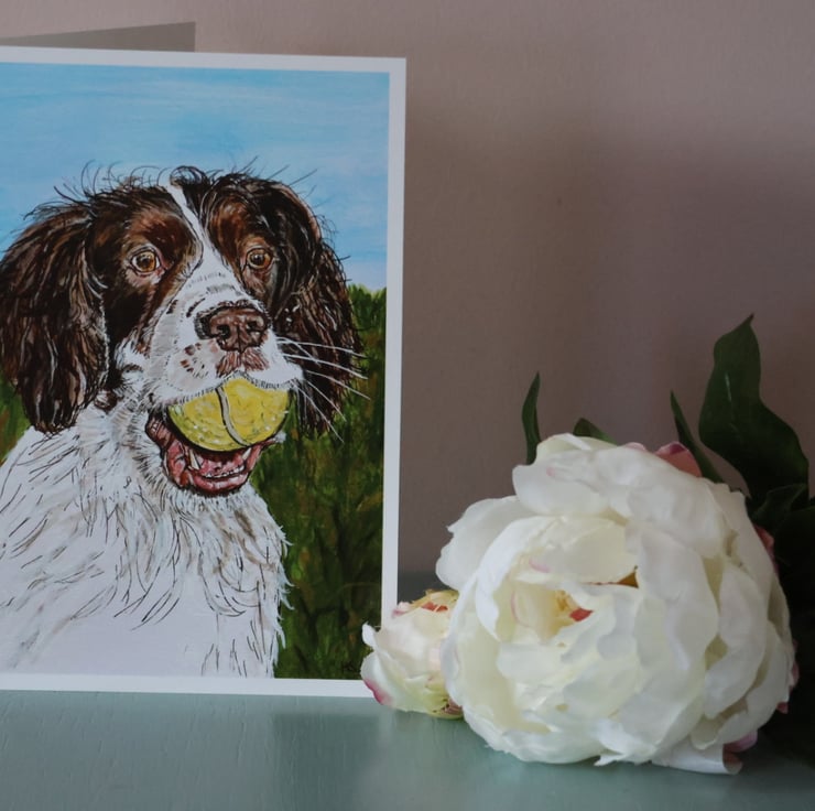 This beautiful greetings card is taken from my original acrylic and fine liner painting. It features a gorgeous Springer Spaniel with a tennis ball in her mouth.