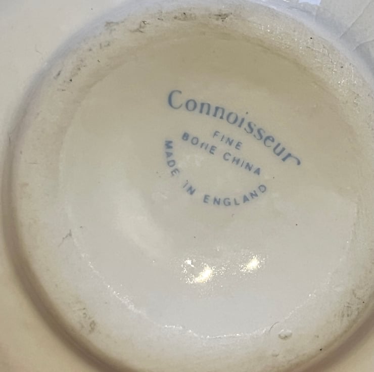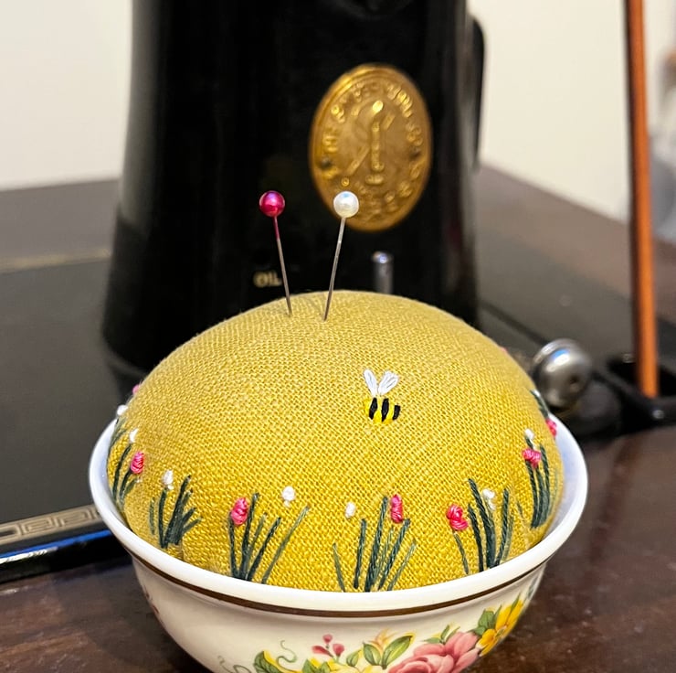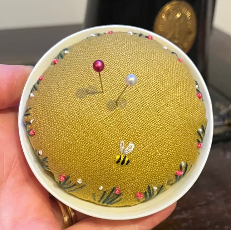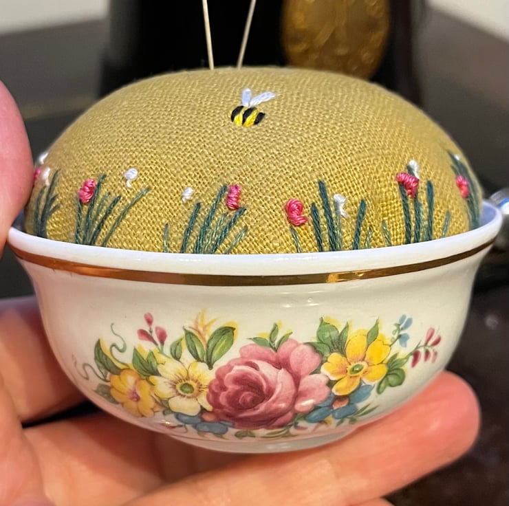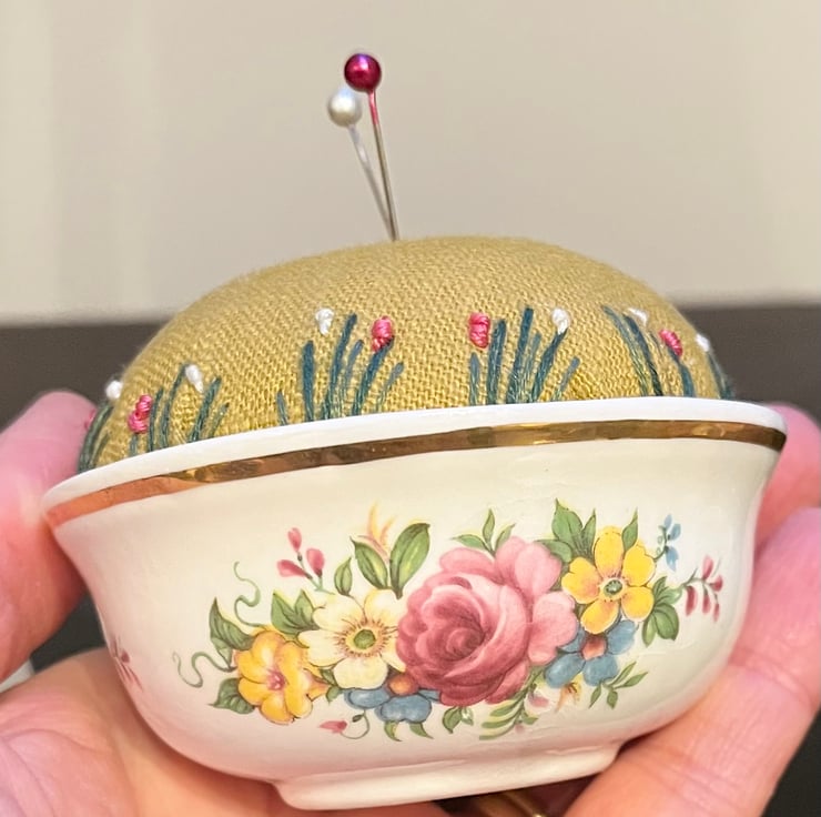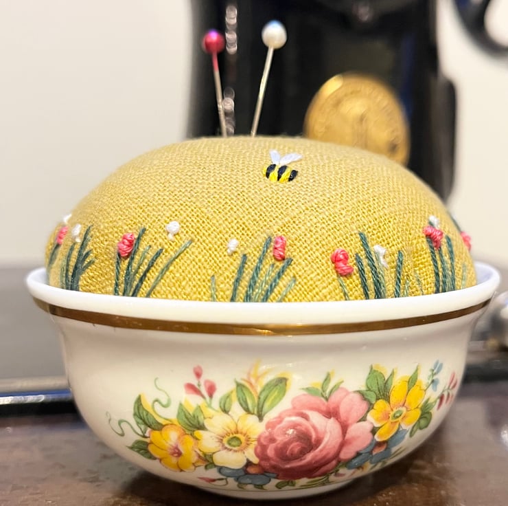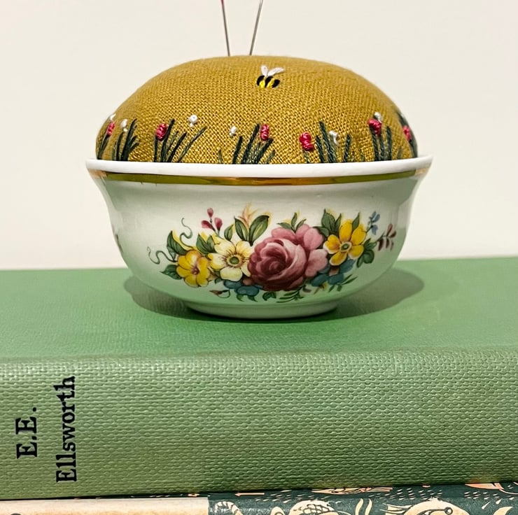 Pretty embroidered pincushion in a small vintage bowl with a colourful rose design and gold edge. The dish holds a mustard linen cushion which has been embroidered with tiny flowers and a bee.