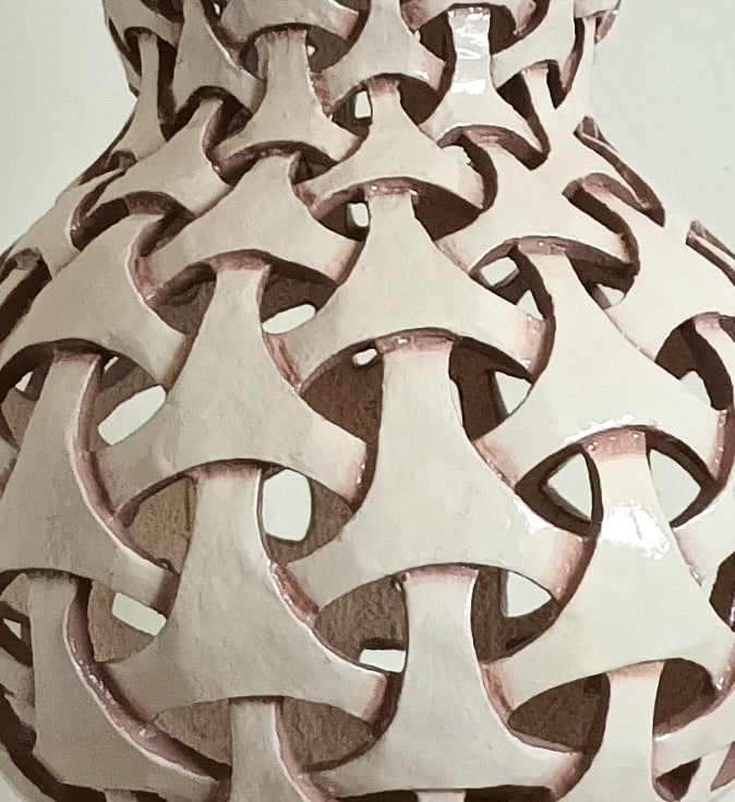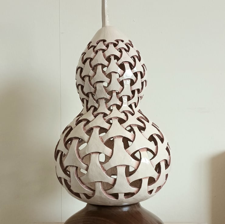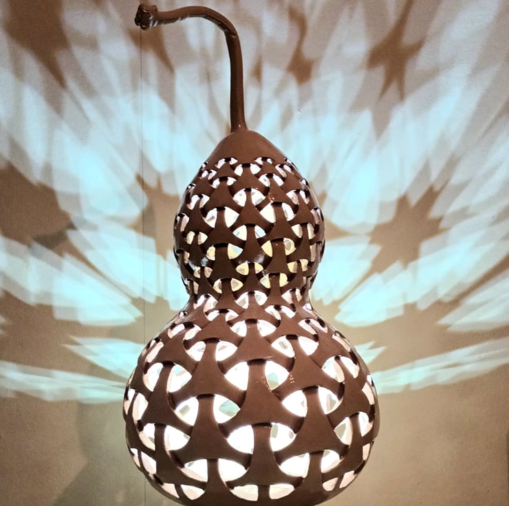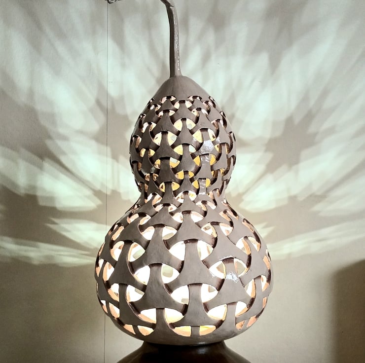 This large homegrown bottle gourd has been intricately handcarved and painted to emulate an interweaving pattern. Creating a mesmerising play of light and shadow.