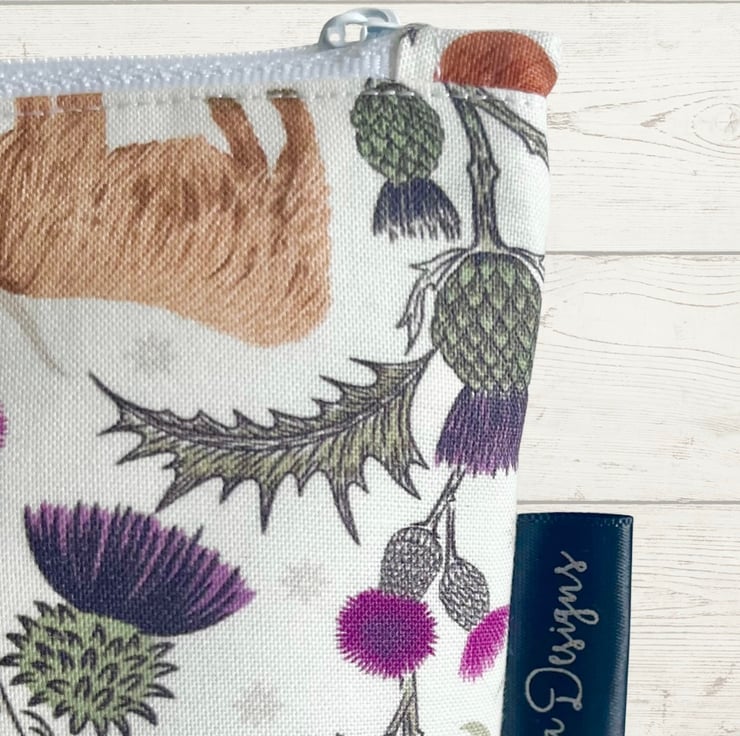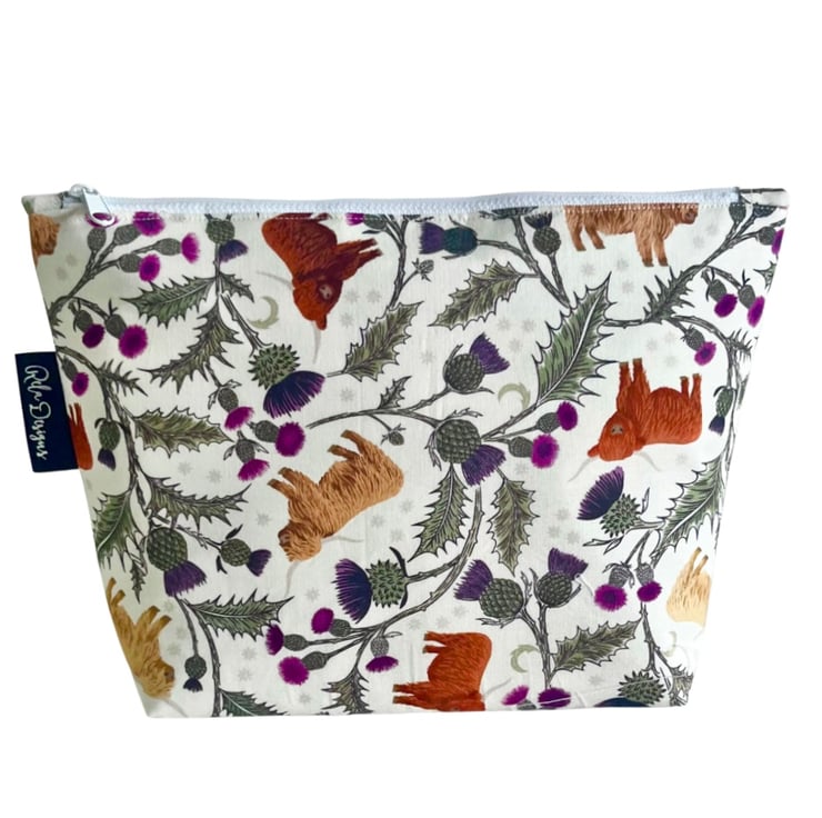 Stay organised in style with this charming large makeup bag! Featuring a unique cotton fabric with adorable Highland cows, Scottish thistles, and holly leaves on a white background, this bag is as functional as it is beautiful.