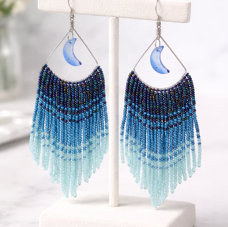 Ombre Handmade beaded Earrings with Tassel and Moon charm
