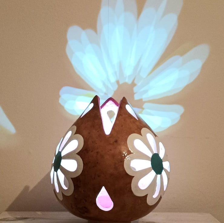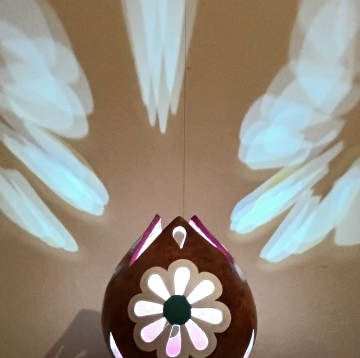 Beautifully shaped gourd with 3 painted flowers with teal green centres. The inside has been painted a dusky rose which emits a warm glow in the evenings.