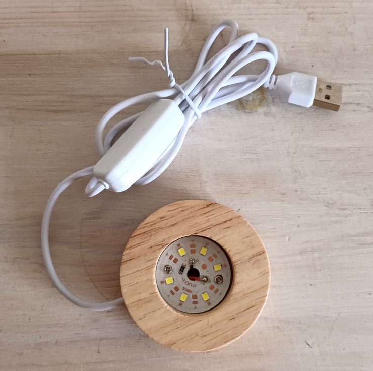 Nestled on a LED wood base with USB port. Base is covered in navy baise.