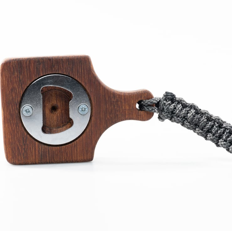 Square palm bottle opener, made in solid walnut with nylon keychain and colourful carabiner.