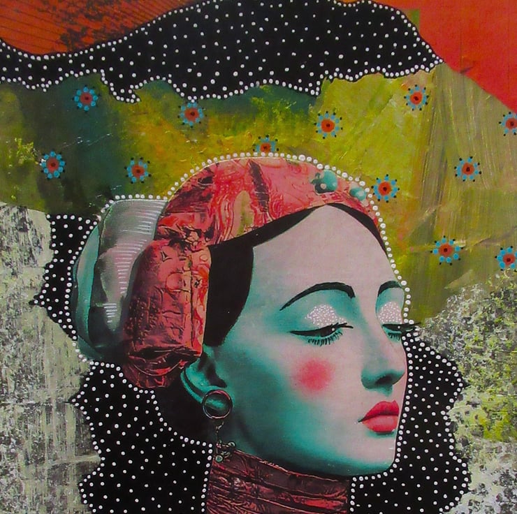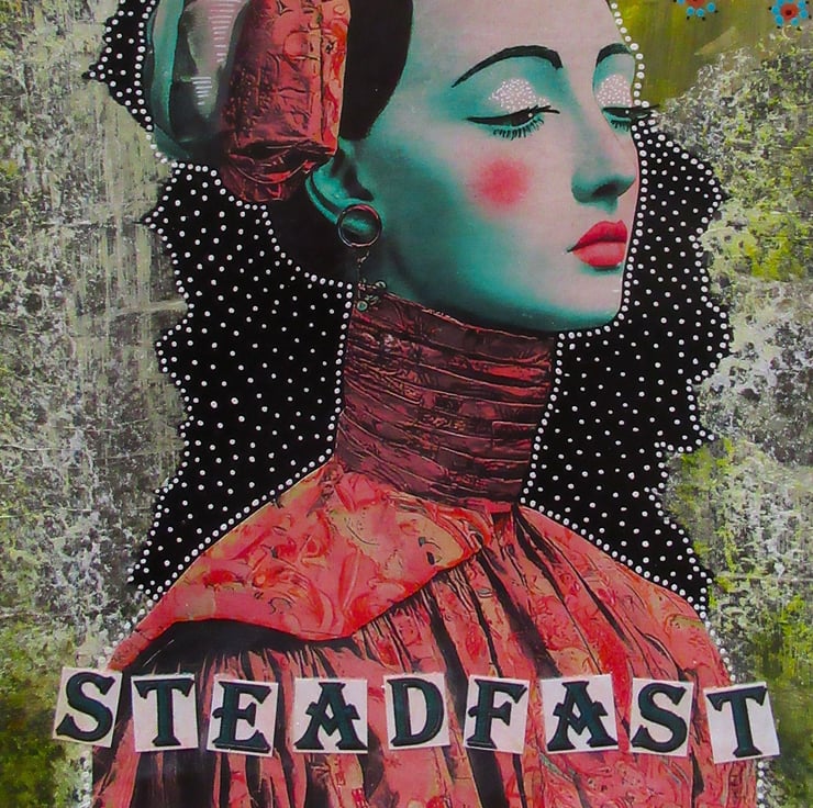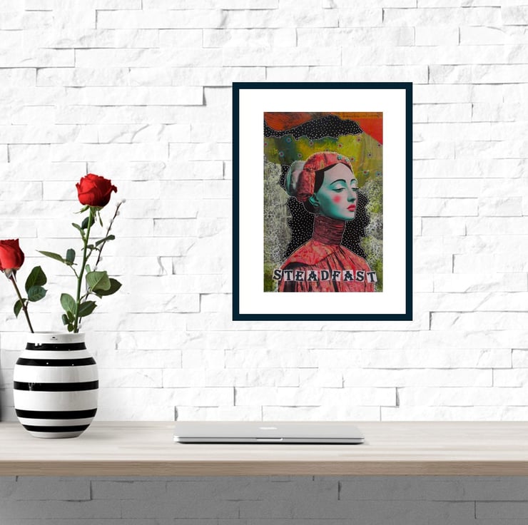 Here is an original mixed media painting in acrylic, collage & drawing pens, exploring inner strength, resilience and quiet defiance. On 2mm deep board and measuring 8 x 12 inches, it has lots of texture and pattern which creates a striking female portrait with a surreal, spiritual edge. The layered surfaces, hand-applied dots and bold contrasts give the work depth and presence, while the word STEADFAST anchors the piece with intention - a reminder of staying grounded, unwavering and true to self.