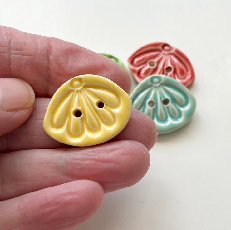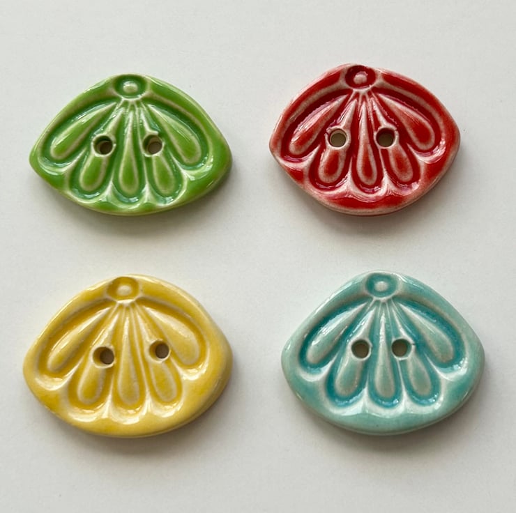 This set of four little pottery buttons have been made from white earthenware clay and embossed with a flower pattern. They measure approximately 2.5cm x 2cm.