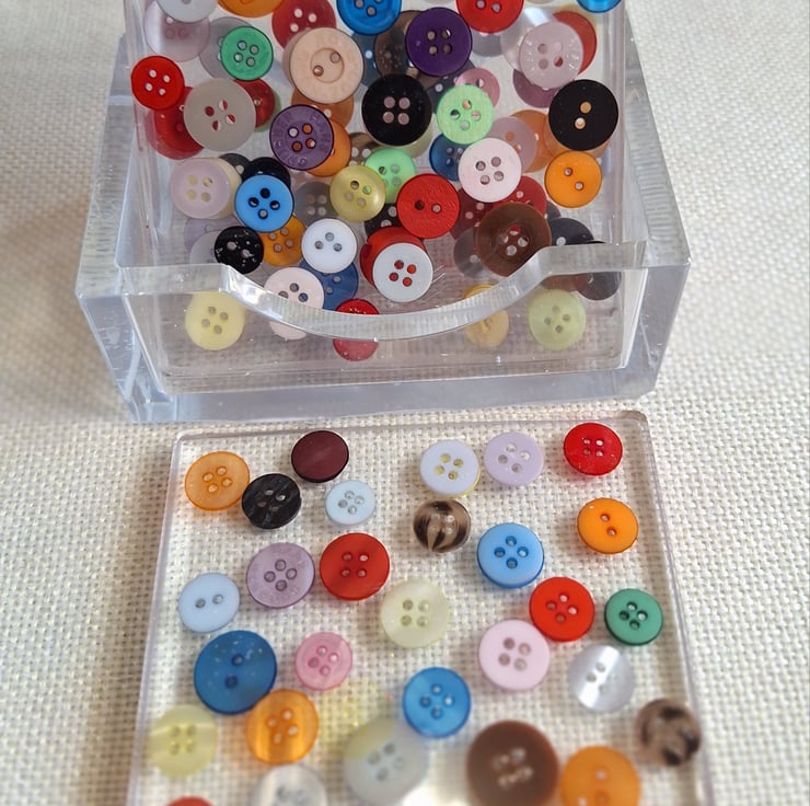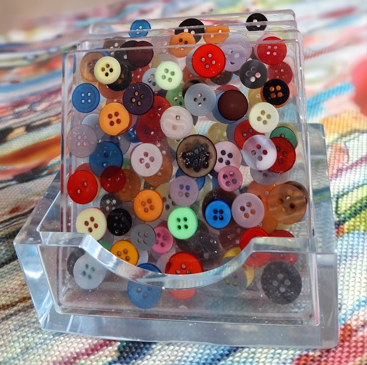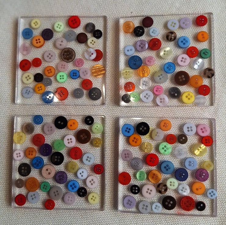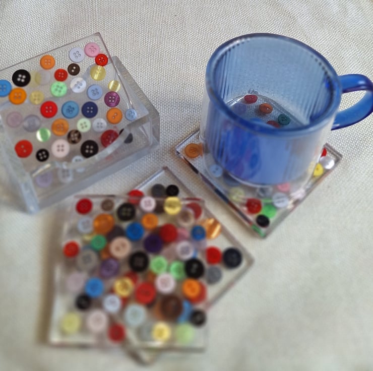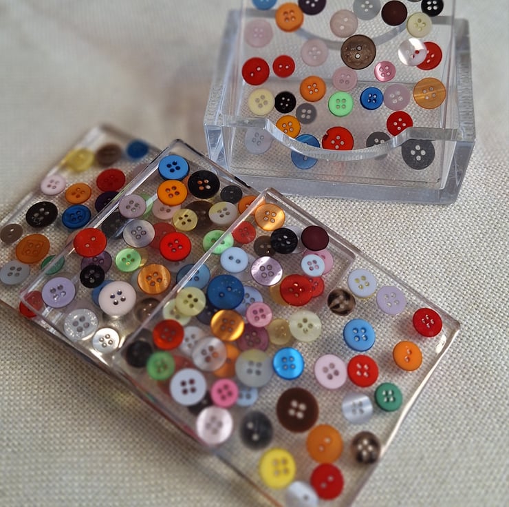 A pretty set of coasters handmade with resin & decorated with an assortment of colourful buttons. After use the coasters can be stacked into a holder.