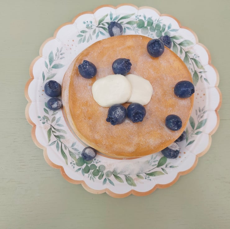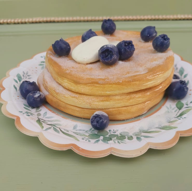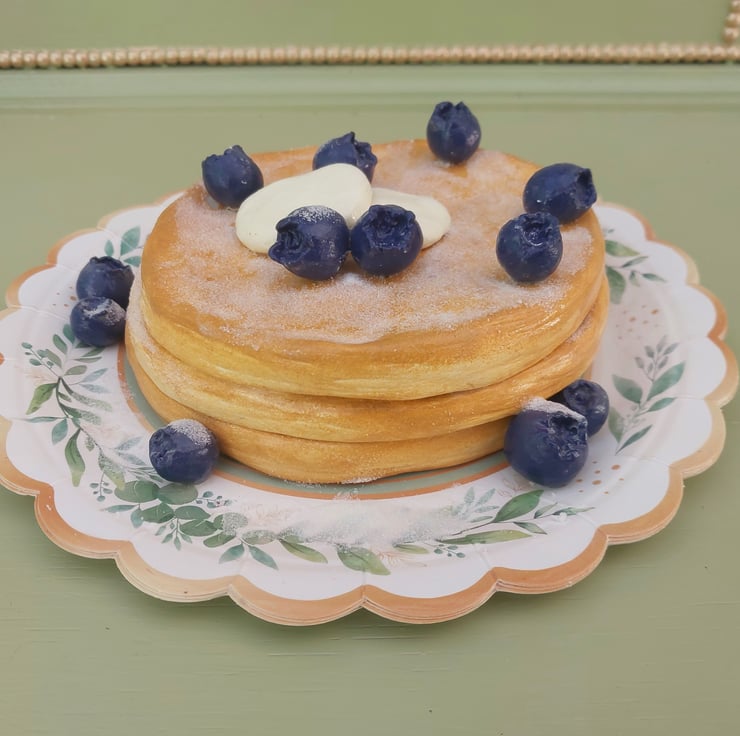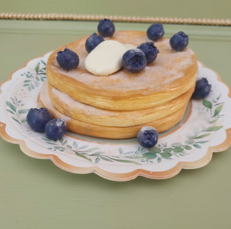 Air Dry clay Stack of pancakes with blueberries and butter on a cardboard plate.