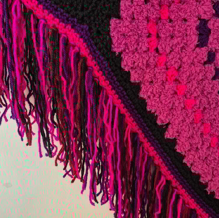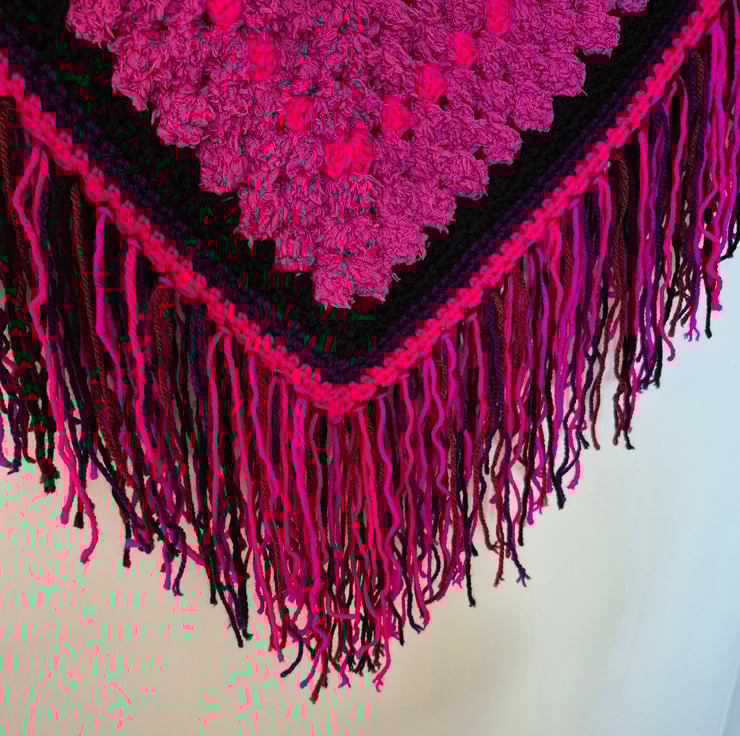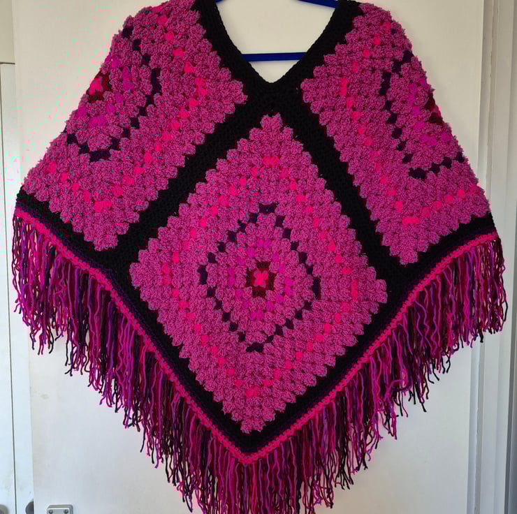 handmade crochet poncho with fringe is a unique and stylish addition to any wardrobe. Made from a soft acrylic yarn and a soft textured polyester yarn in pink and black. The crochet granny squares design gives it a hippie-inspired charm. Easy to care for, machine washable at 30°. This unisex poncho is perfect for adding a touch of boho chic to any outfit. The fringe accents add a touch of whimsy to this trendy and versatile piece, making it a must-have accessory for those who appreciate handmade craftsmanship and eclectic style.