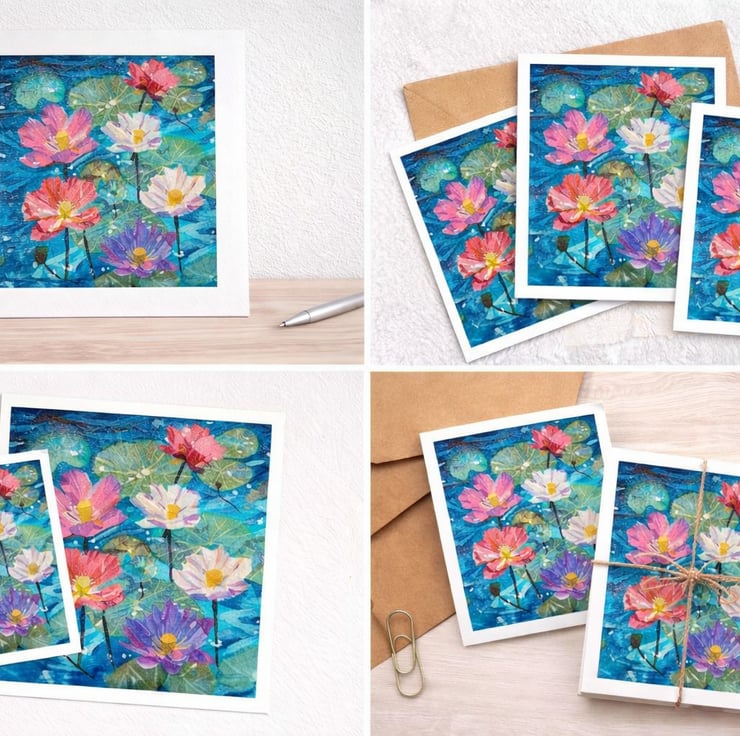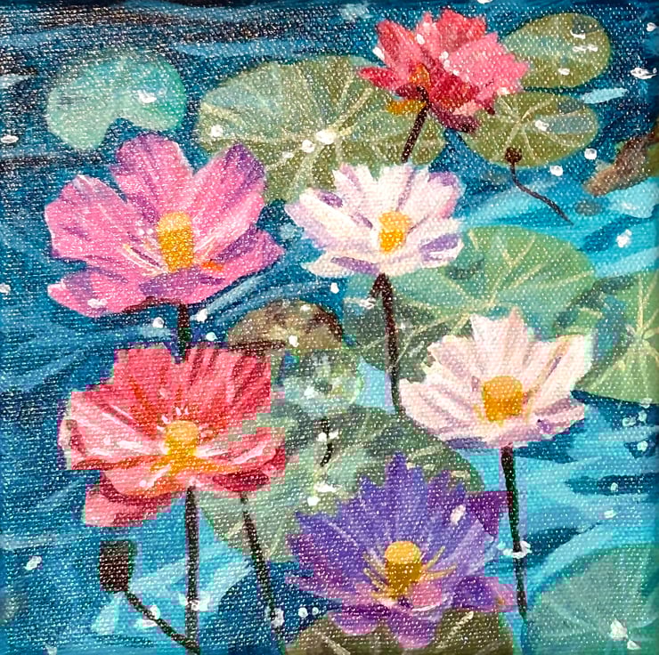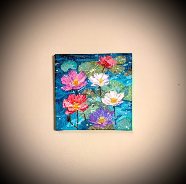 This is an original, hand painted acrylic painting completed over three days on a 6x6 square canvas. It’s unframed but the edges are painted with the back having my signature. It’s inspired by my perpetual love for water lilies and the magic they create in any setting, in this case a blue pond.