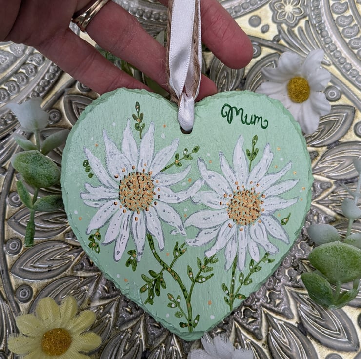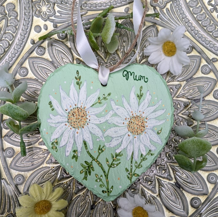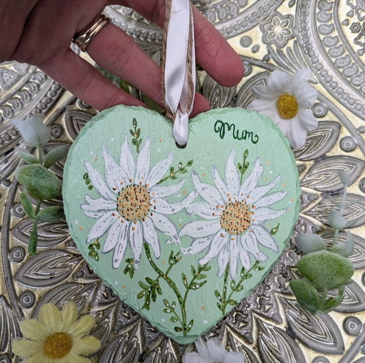 A sweet Daisy hand-painted slate heart with the wording "Mum" on it. A lovely unique gift for Mother's day or a special birthday.