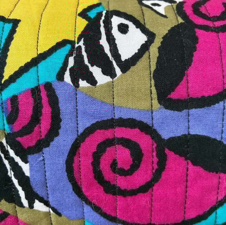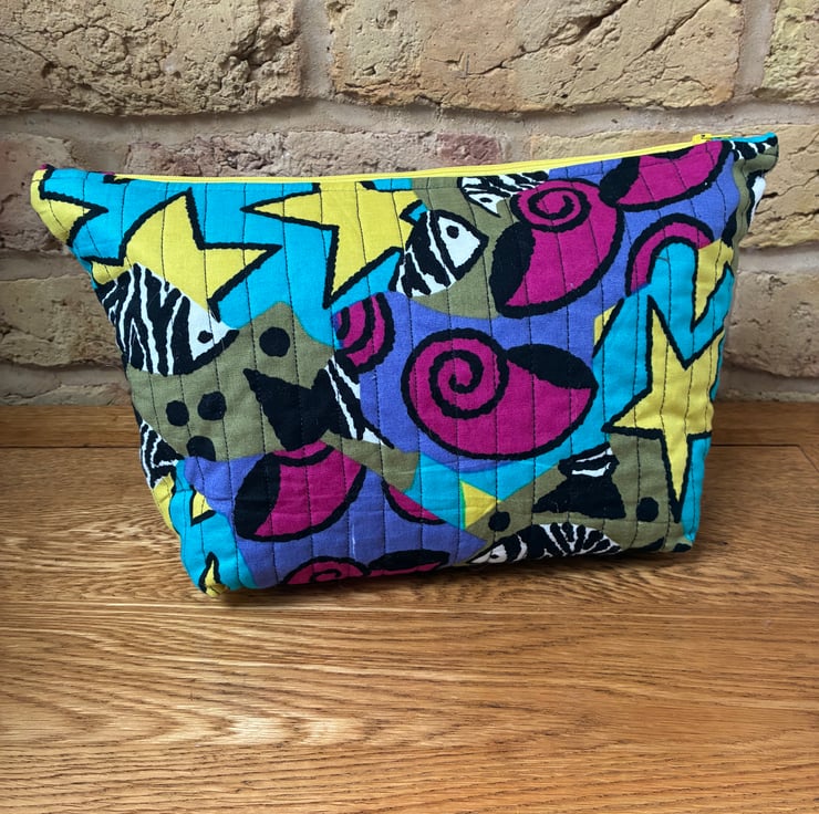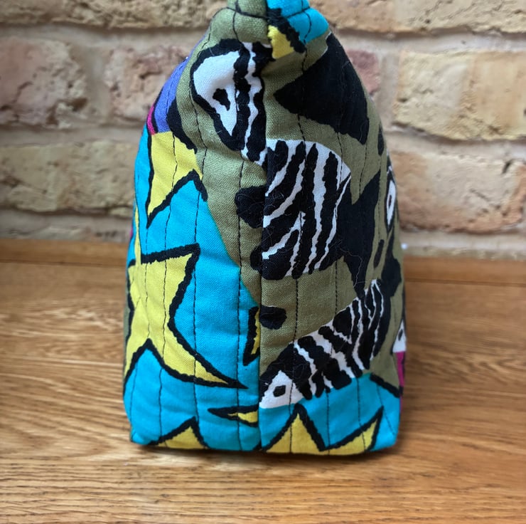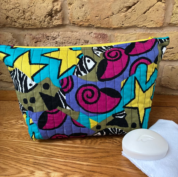 The quilted wash bag is made from this striking fish, shells and stars print cotton fabric.