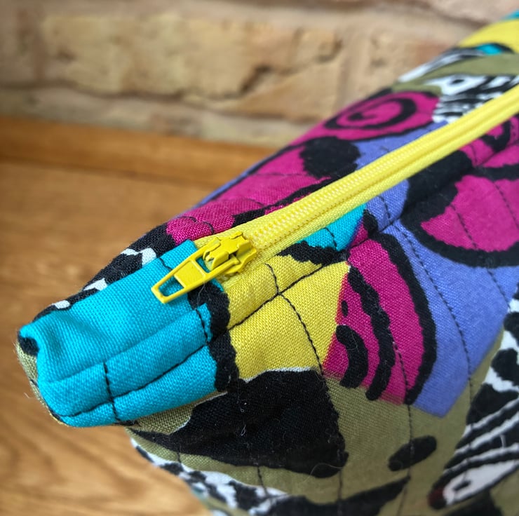 The bag is quilted with black stitching and the yellow zip is finished with tab ends.