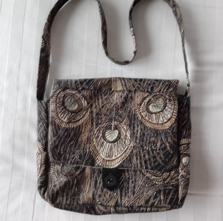 Lovely shoulder bag made from a remnant of Liberty linen union in "Hera" design. Lined in plain grey, and fastening with a loop and button.