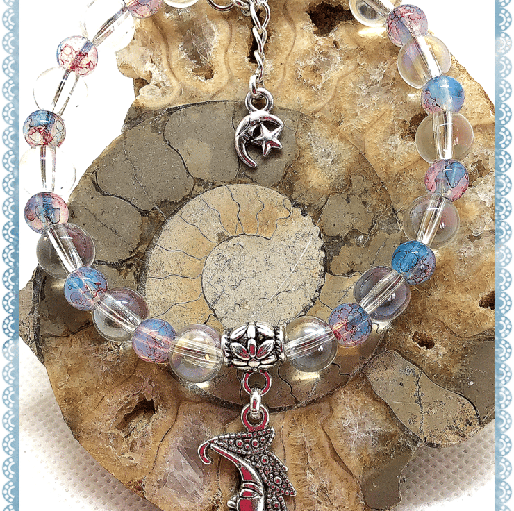 Created using this lovely Tibetan silver crescent moon charm onto a connector with 8 mm AB clear glass beads and blue pink 6 mm beads, threaded onto memory wire to form a bangle style bracelet, finished with a lobster clasp, extension chain with a moon charm. Nickel free