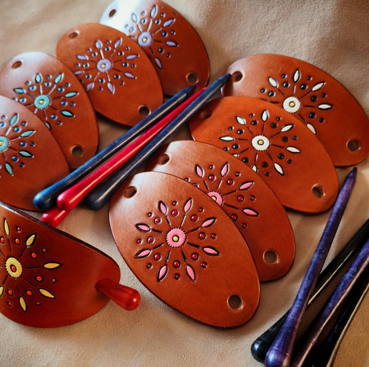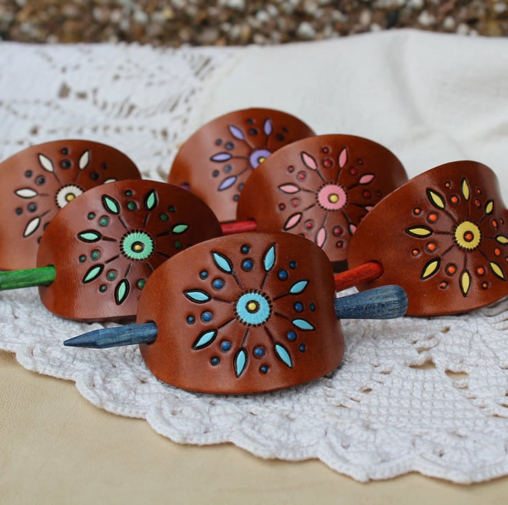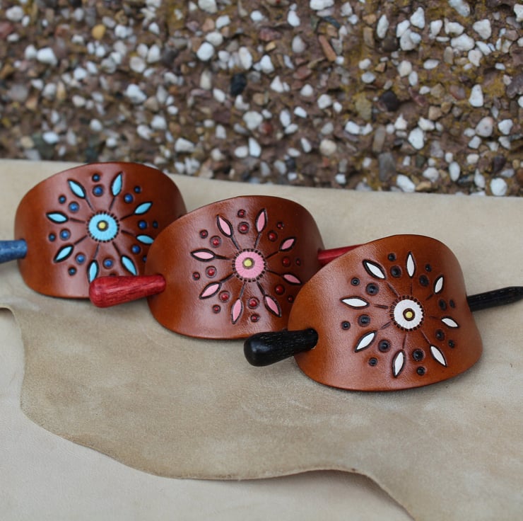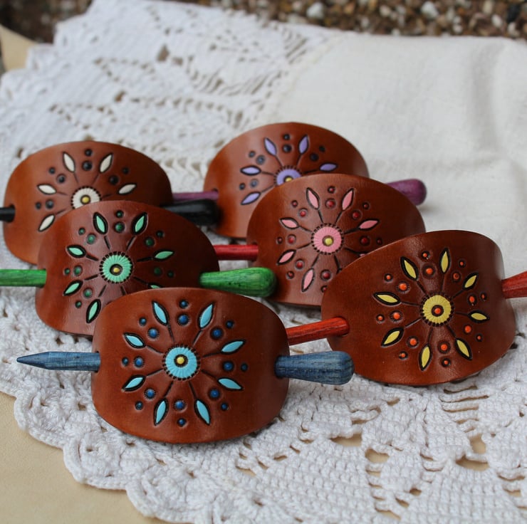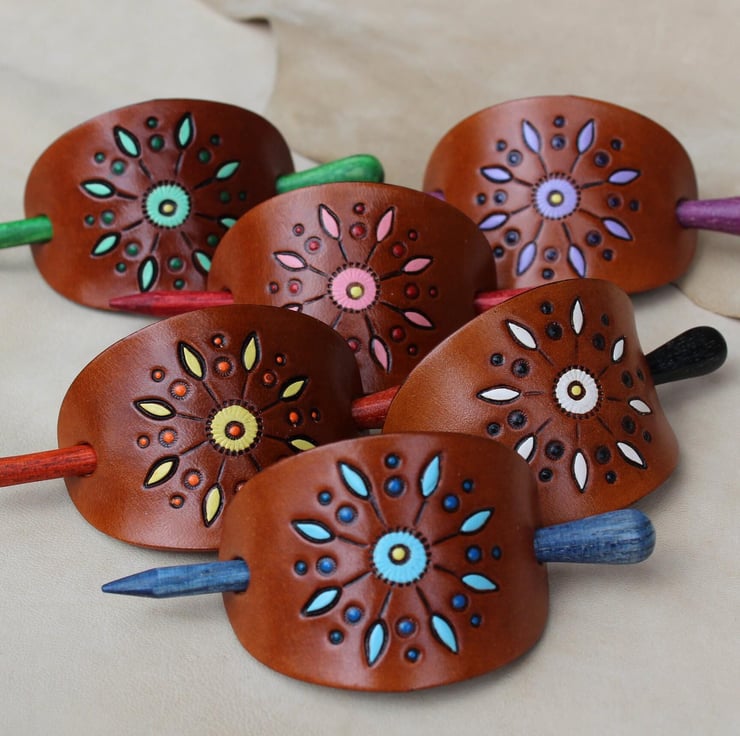 This hand made leather barrette is made from high quality vegetarian tanned leather. Hand tooled and painted with mandala pattern in six different colours.