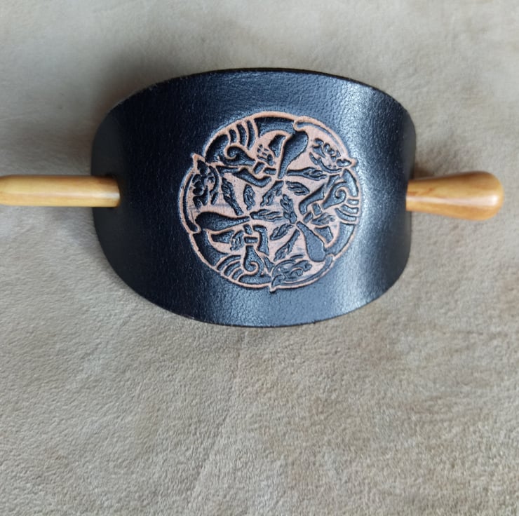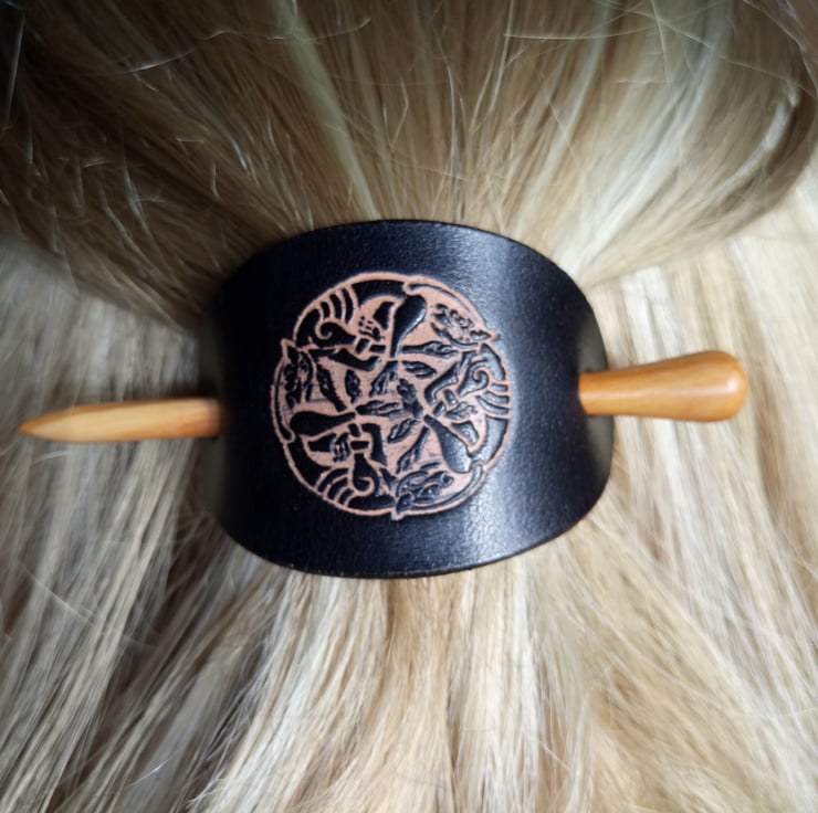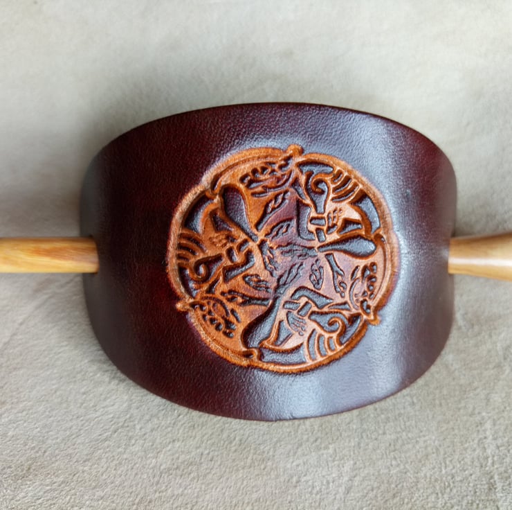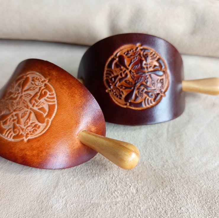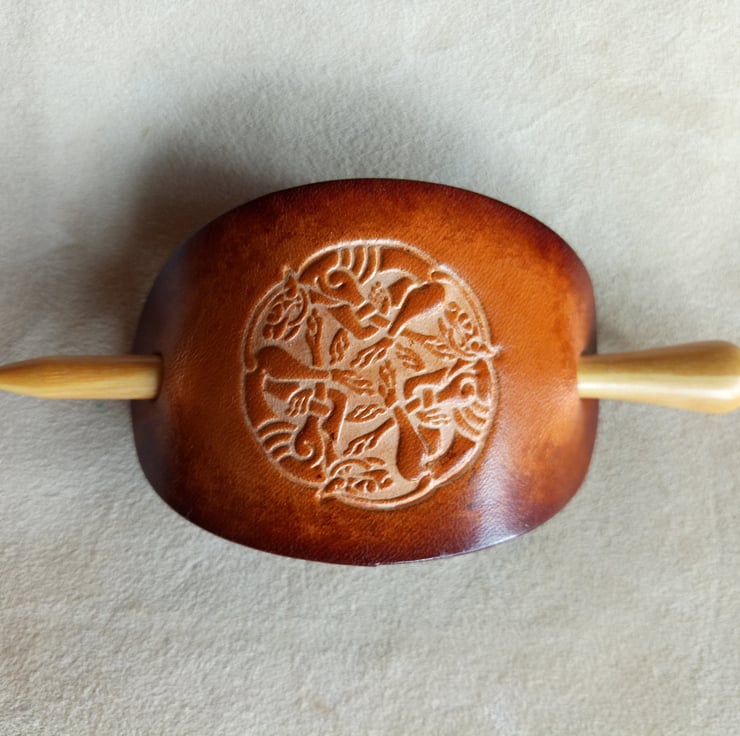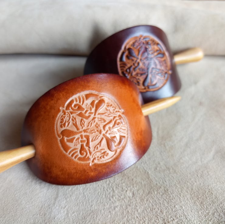 We designed and made these traditional leather hair barrettes with a Celtic pattern.