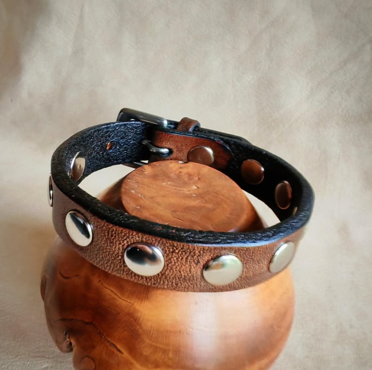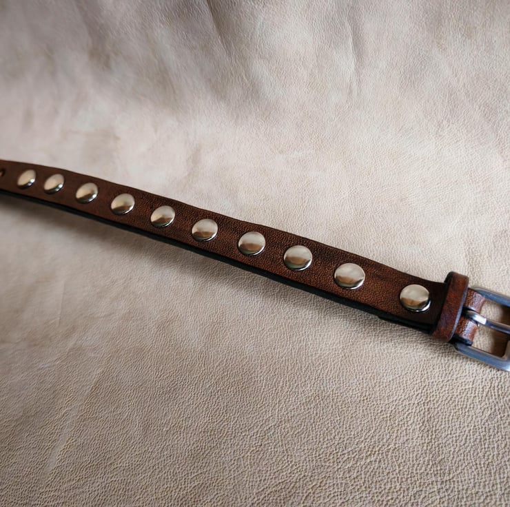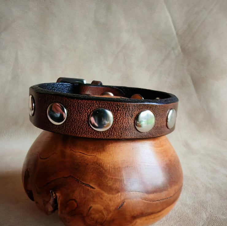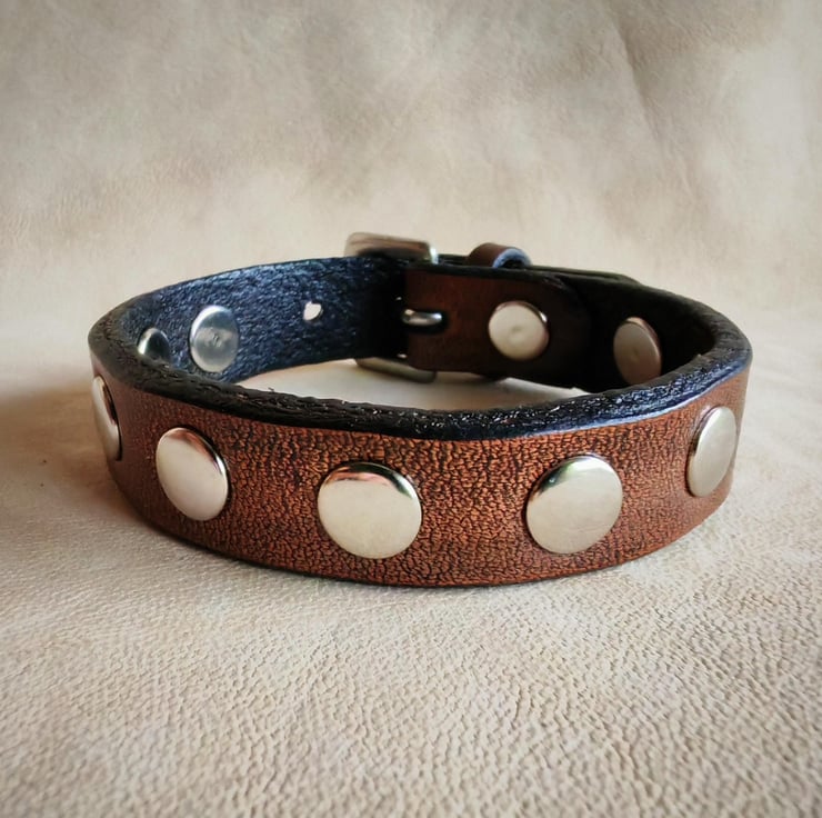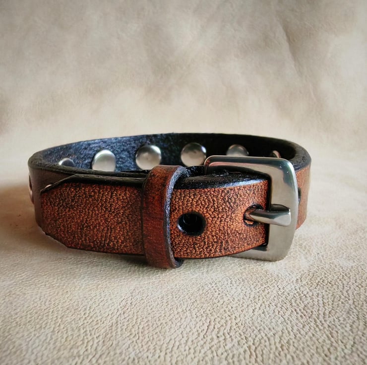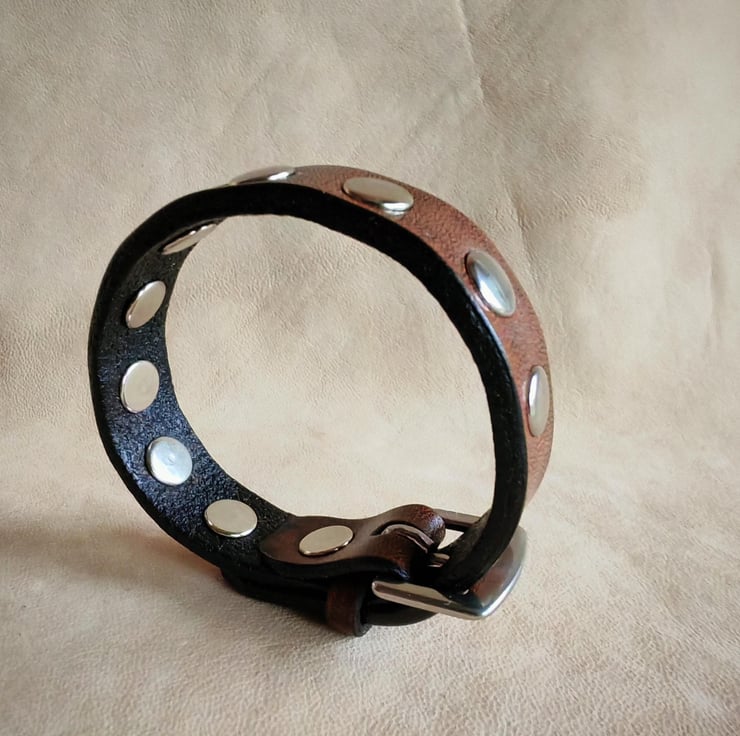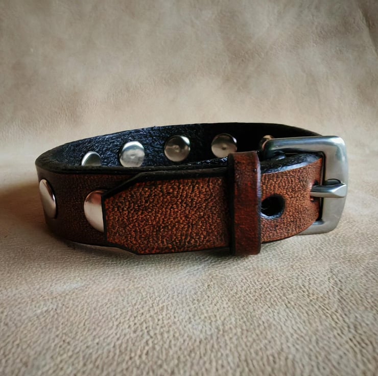 Embrace timeless style with our classic leather stud bracelet, crafted from premium vegetable-tanned leather for durability. This sophisticated accessory features round-shaped rivets, adding a touch of edge to its classic design. The bracelet is finished with a stainless-steel buckle closure that ensures a secure fit, adjustable to three sizes for personalized comfort. Perfect for everyday wear or adding a subtle statement to your outfit, this bracelet combines quality craftsmanship with versatile style.