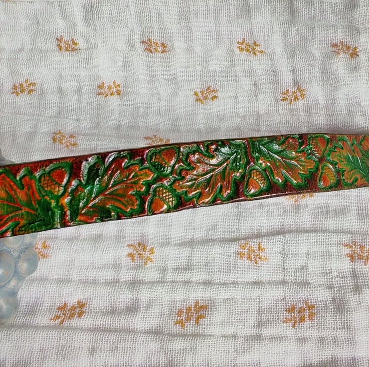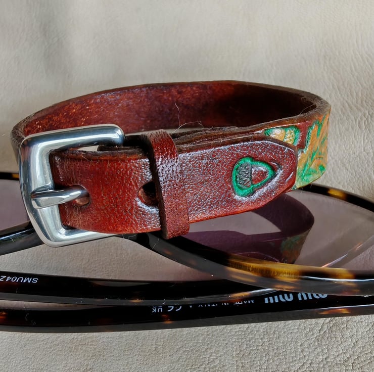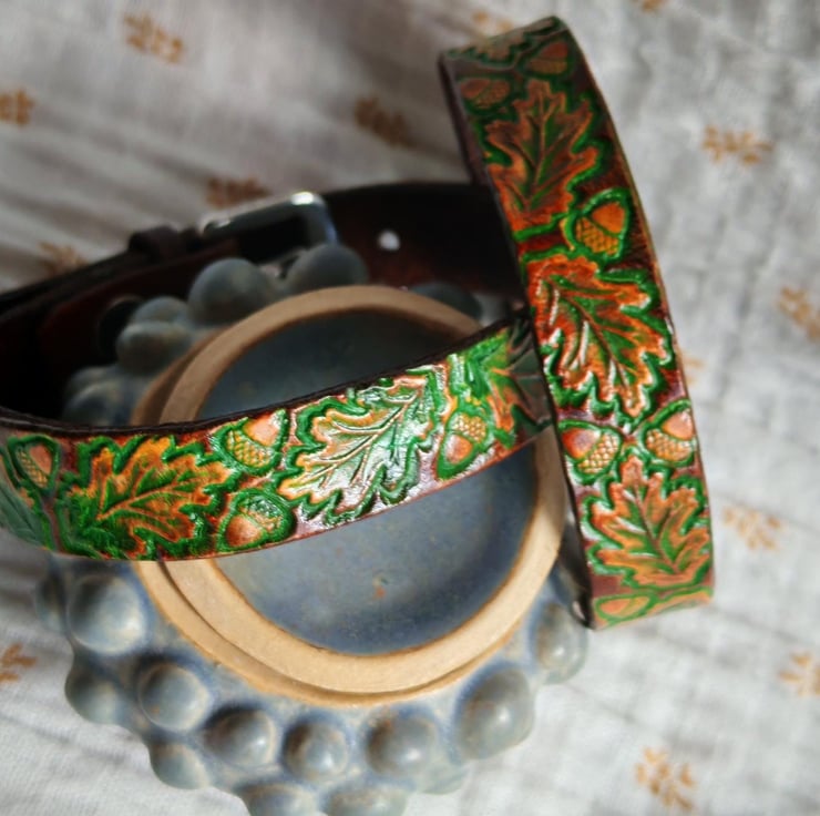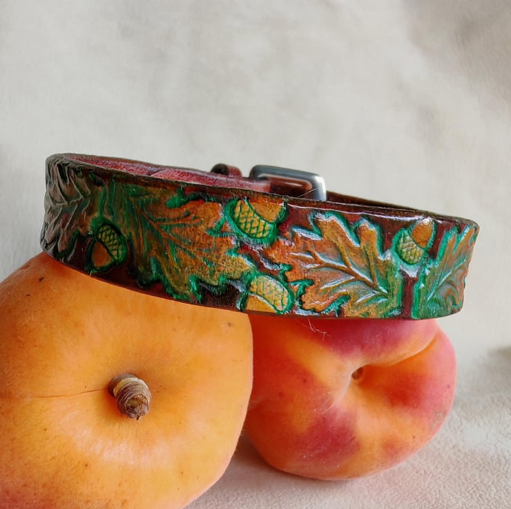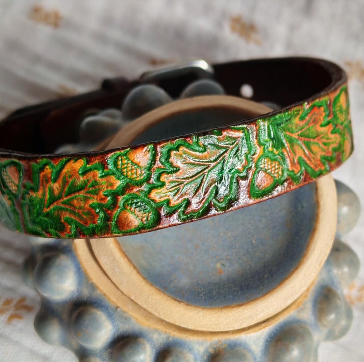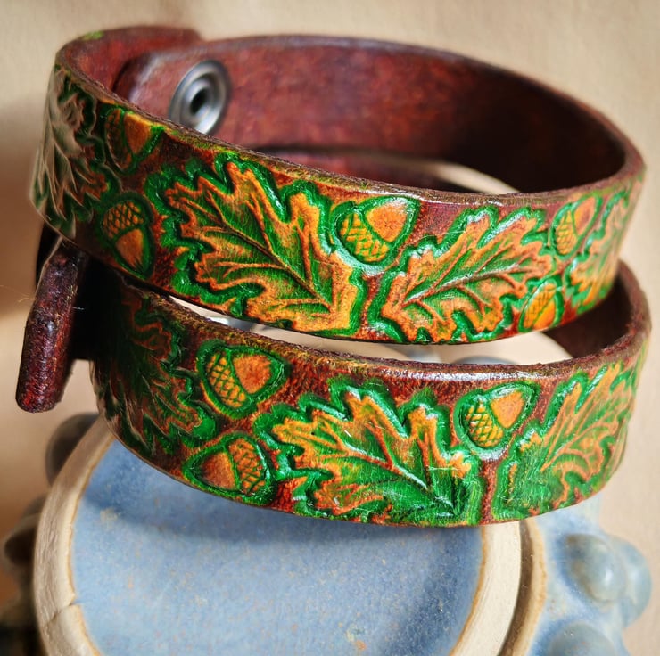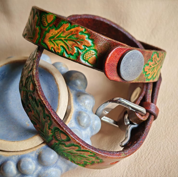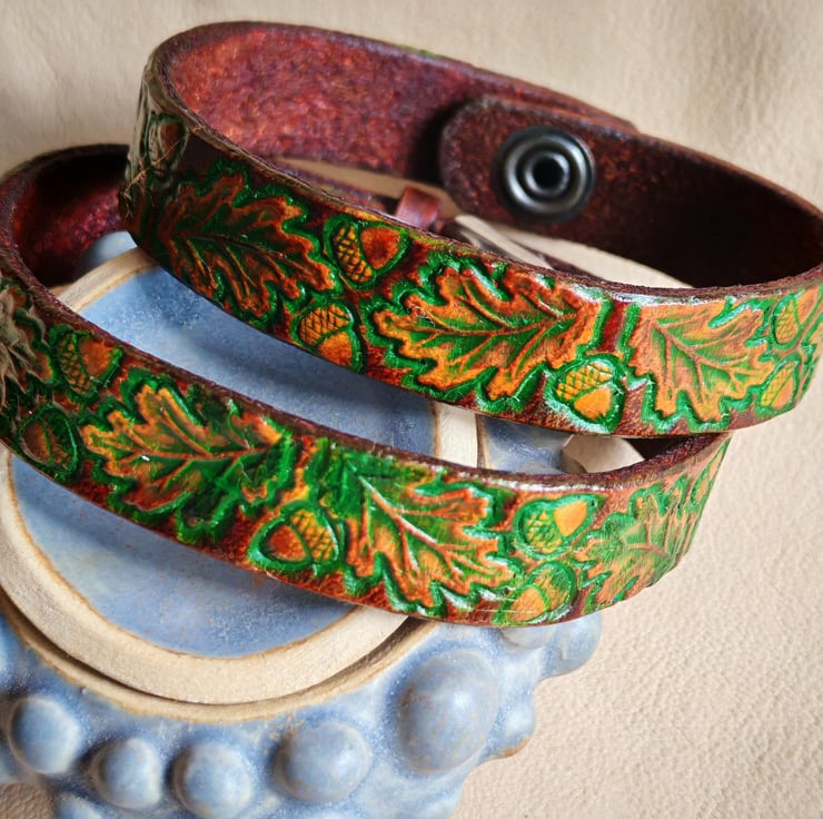 Beautifully handcrafted leather bracelet decorated with an oak leaf and acorn pattern.