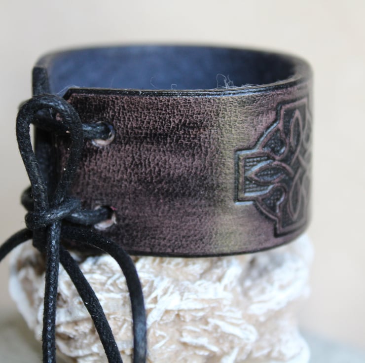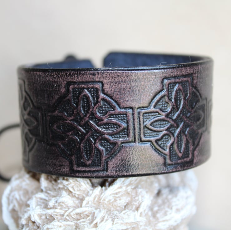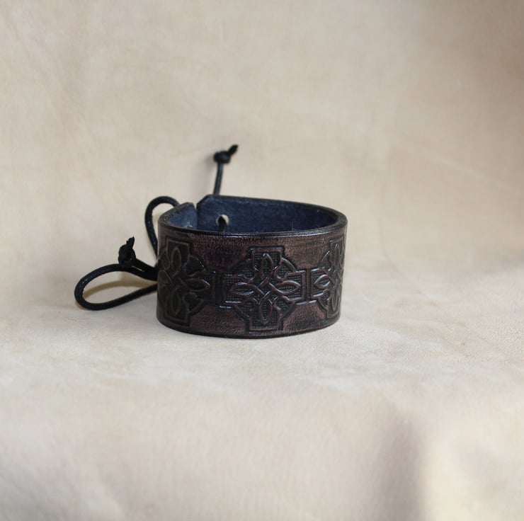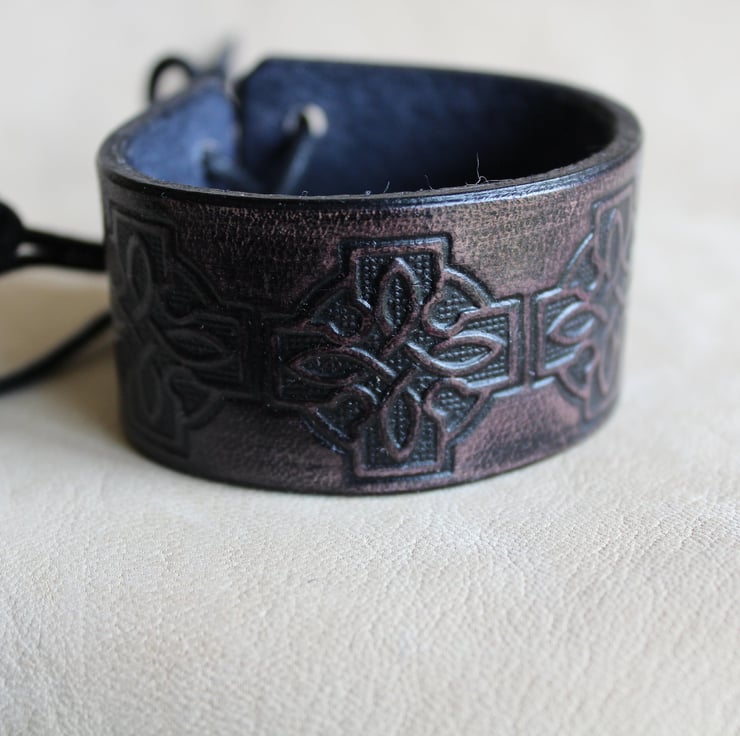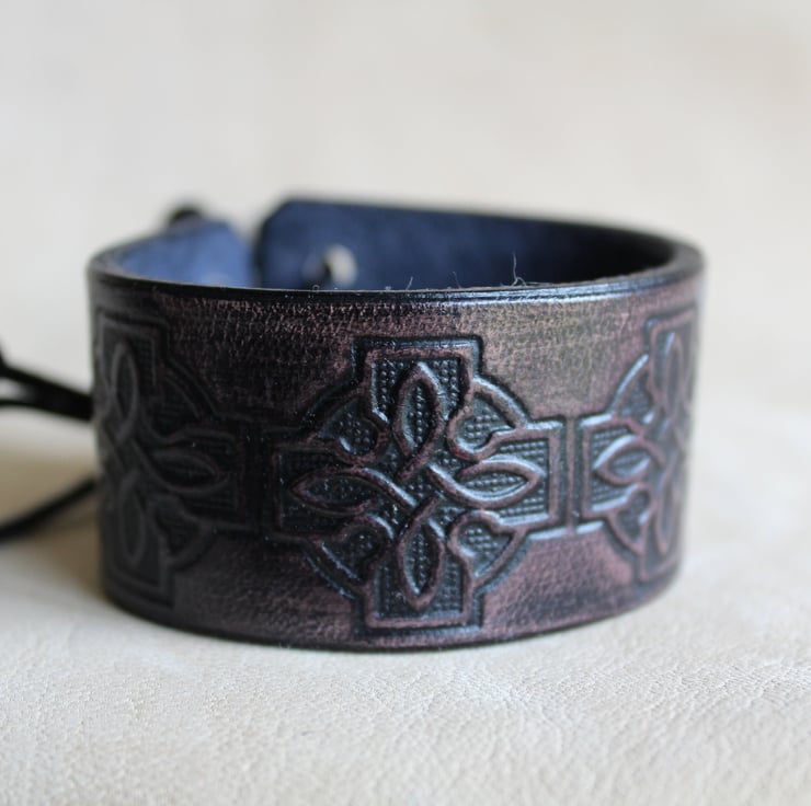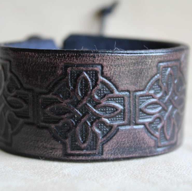 Hand crafted leather bracelet cuff for men and women with a celtic cross embossed design.
