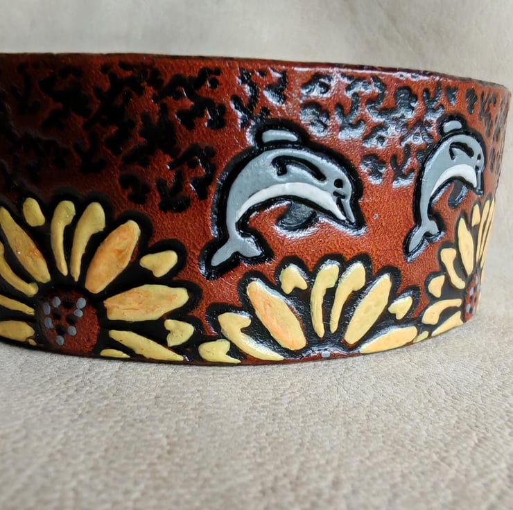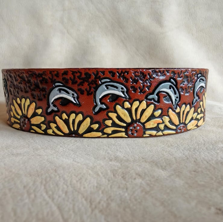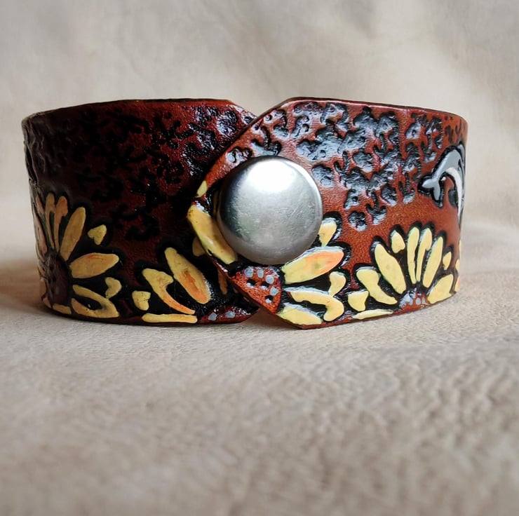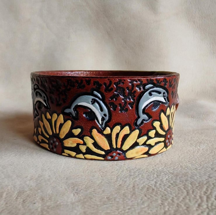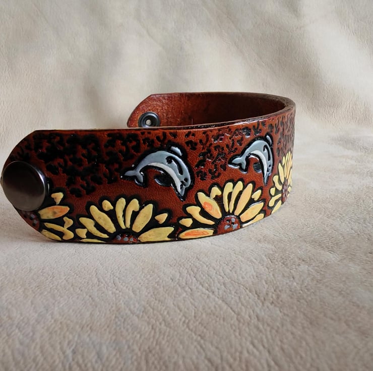 Hand-painted and hand stamped bracelet featuring dolphins swimming gracefully among blooming sunflowers.