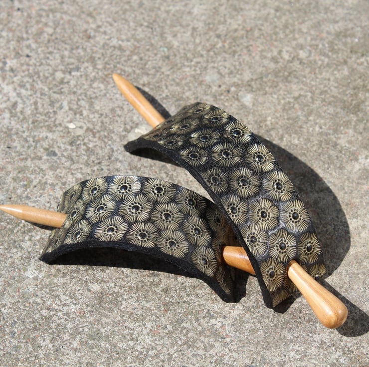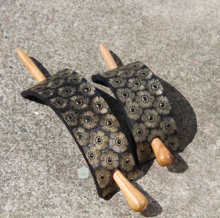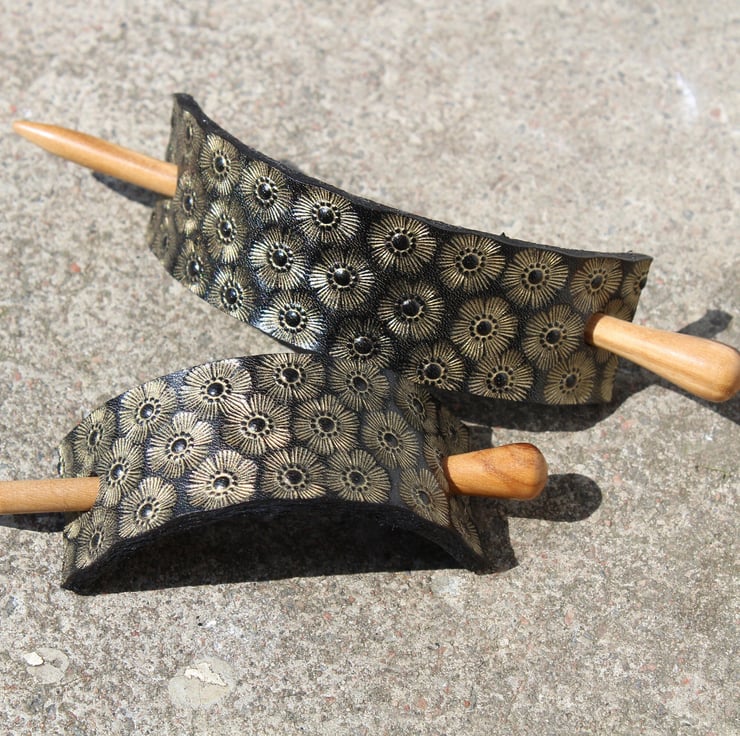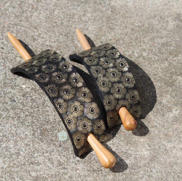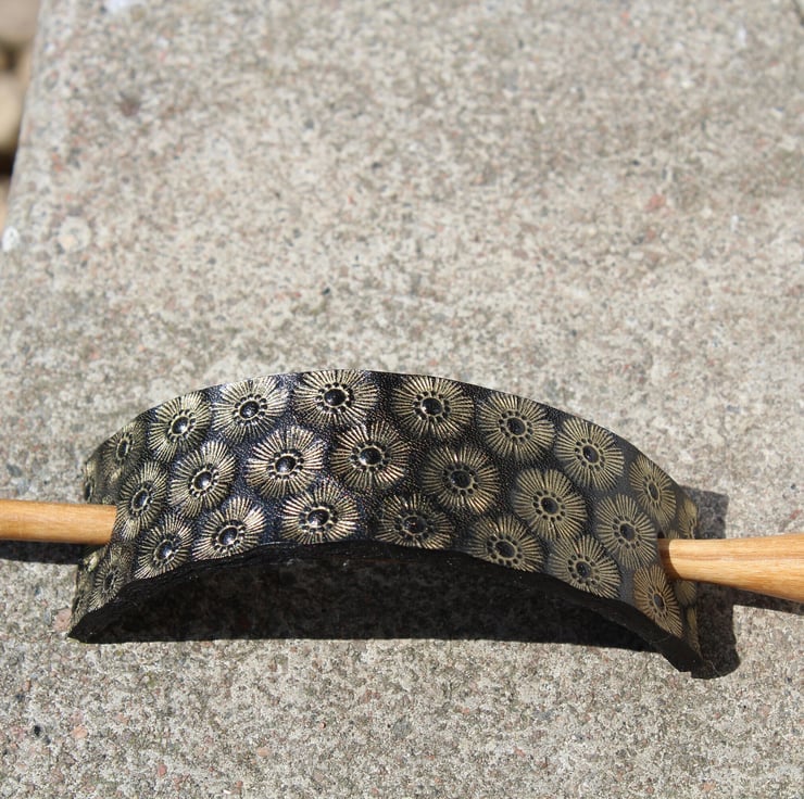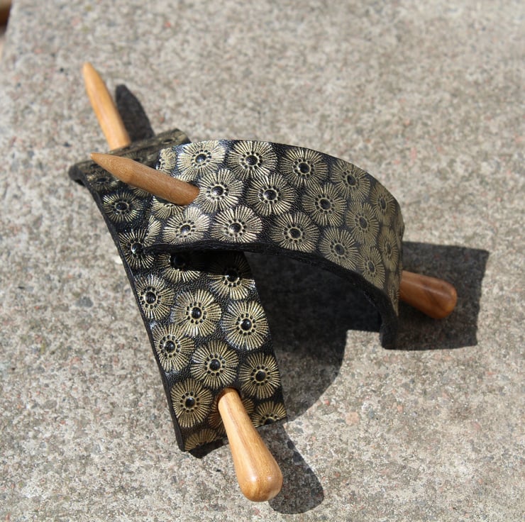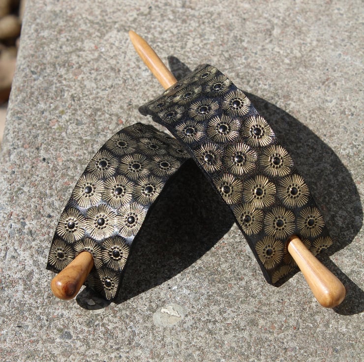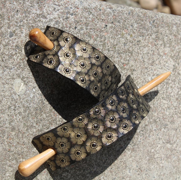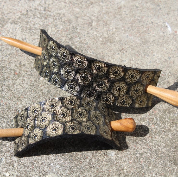 Beautifully hand crafted leather hair barrette with wood stick.