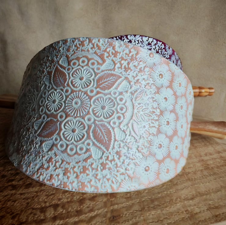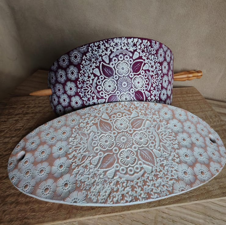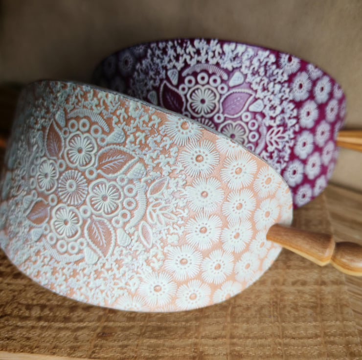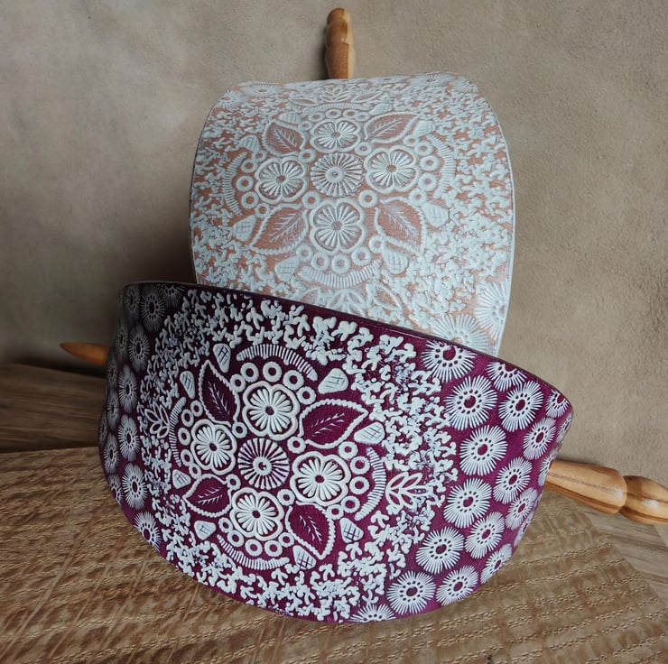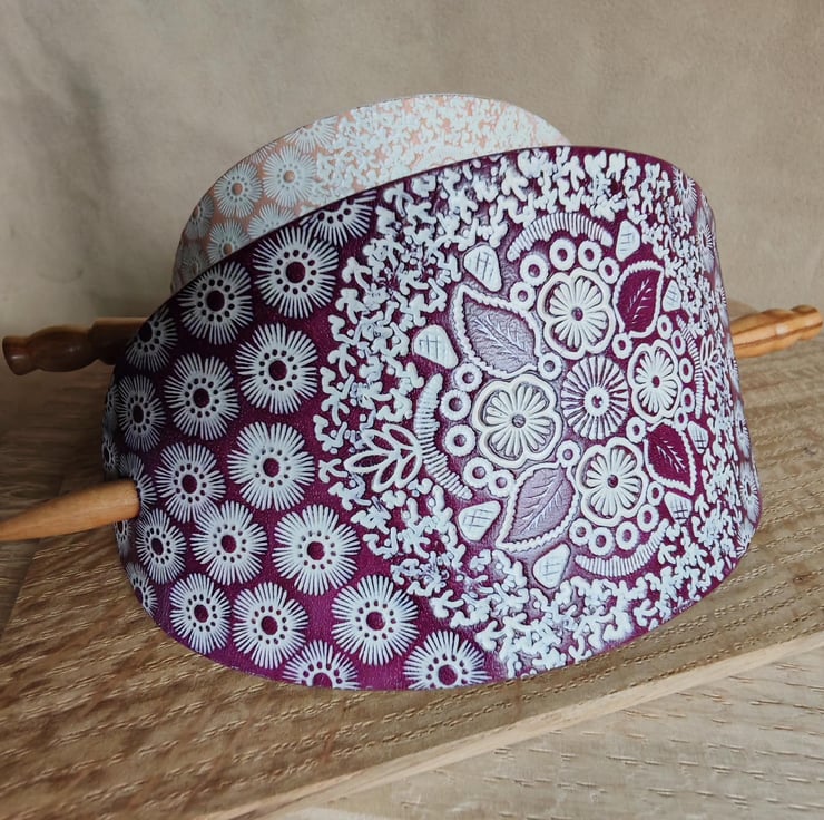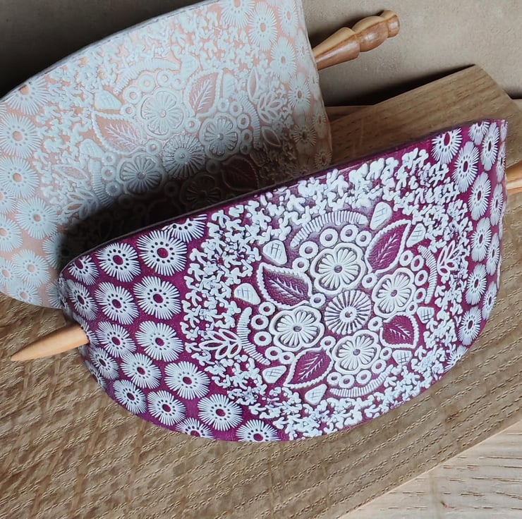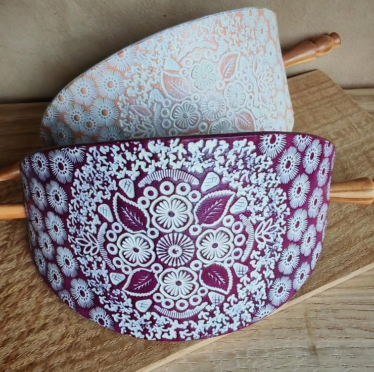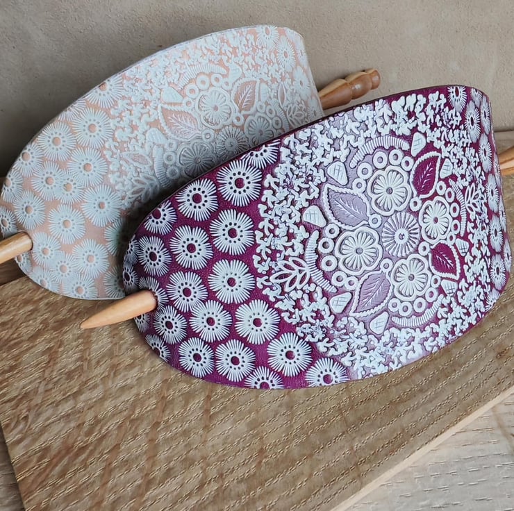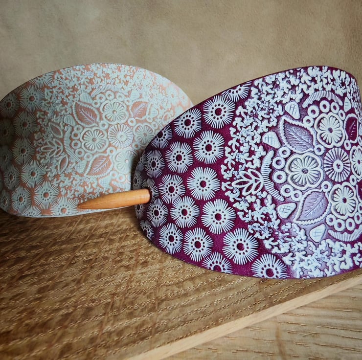 Handcrafted, eye-catching large hair clip with a turned wooden stick. The carefully prepared leather is decorated with an interesting stamped pattern, which is further highlighted by the white colour against the background. The product is available in two base colours: natural or purple.