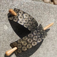 Extra-large leather hair barrette with wooden stick. Hand Stamped Hair Clip in W
