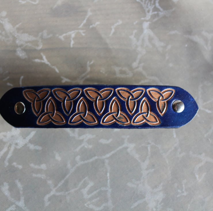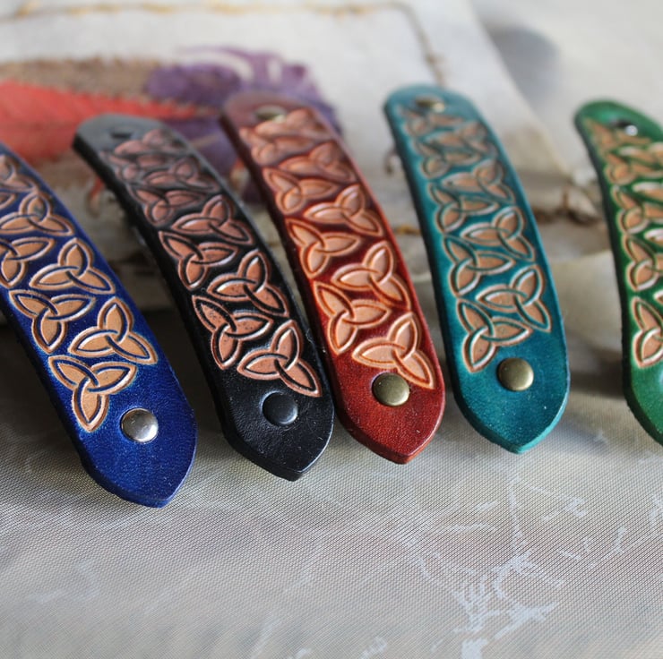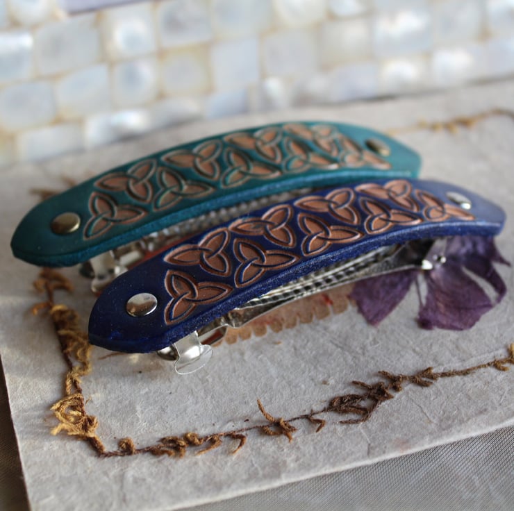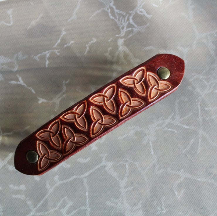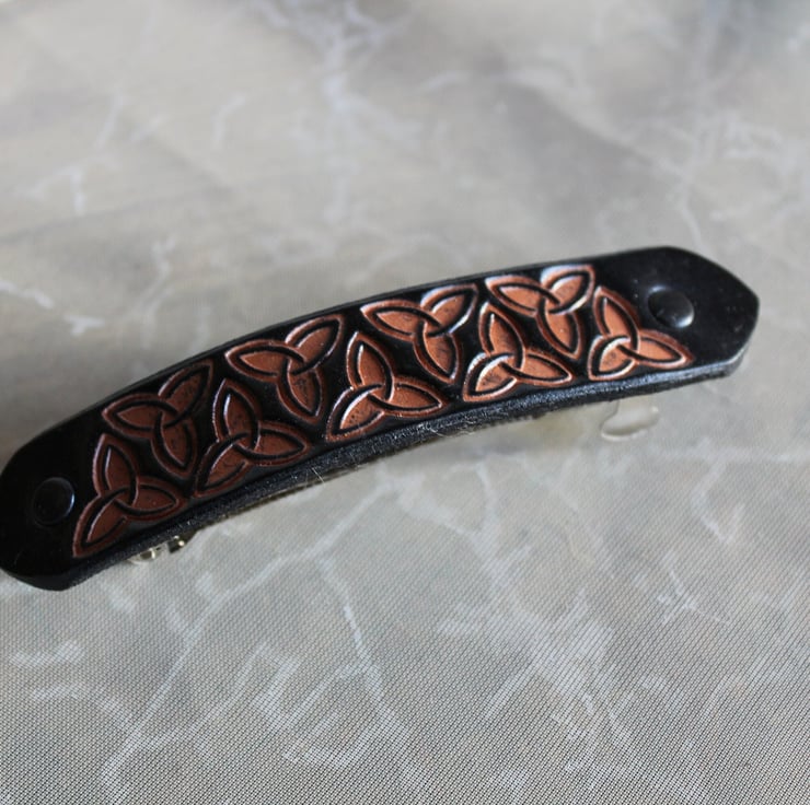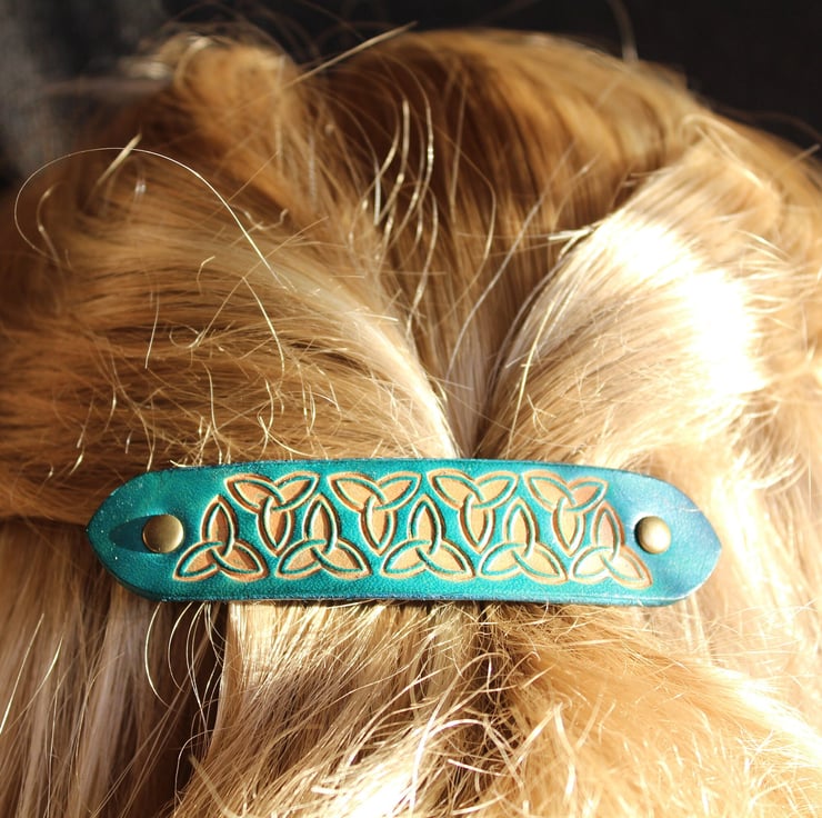 This hand tool crafted leather hair barrette is made of 3-4 mm thick vegetable tanned leather. It is hand cut, dyed and patterned with tools in a Celtic knot design.