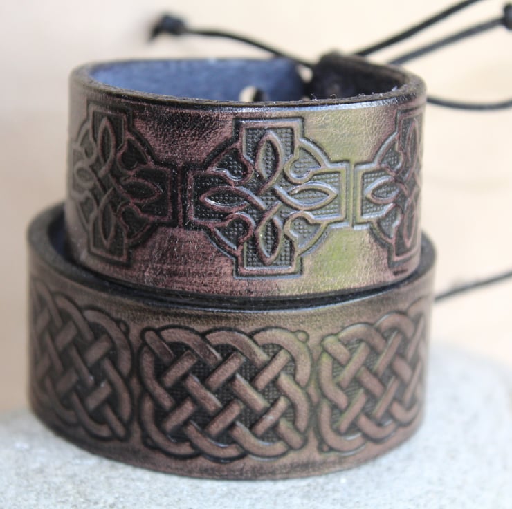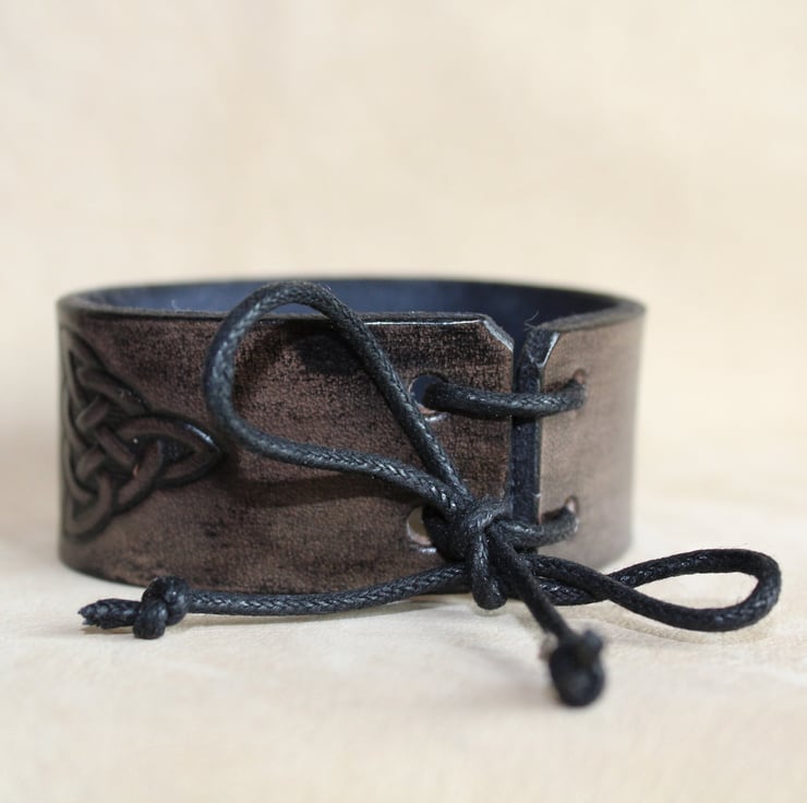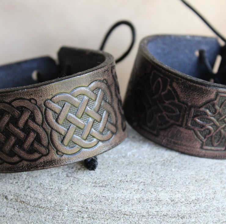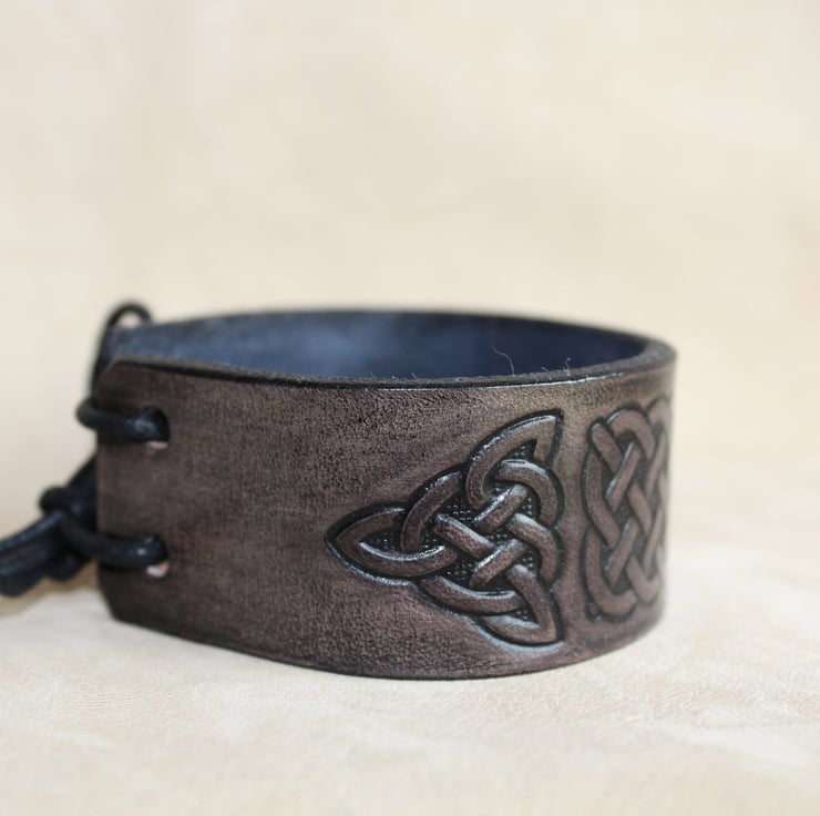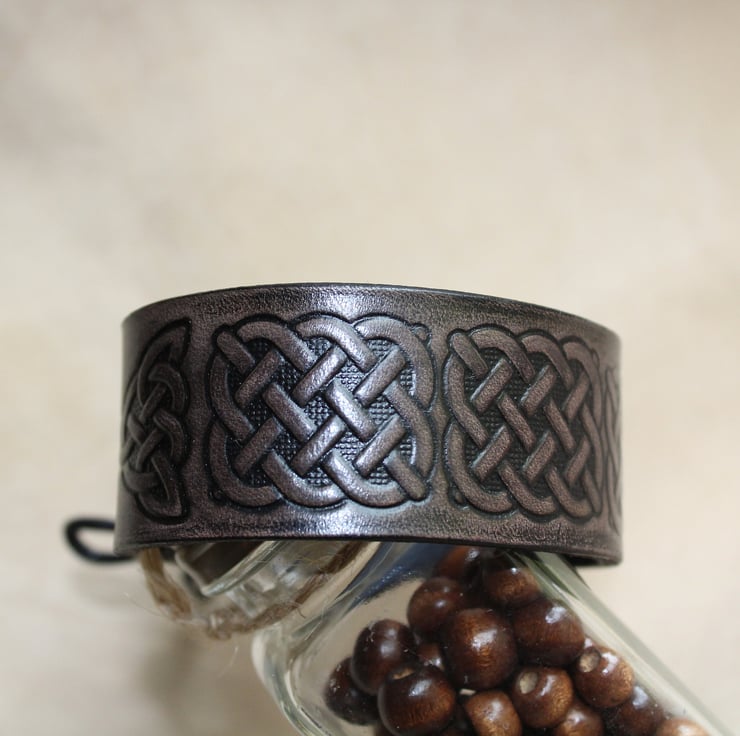 Hand crafted leather bracelet cuff for men and women with an embossed Celtic knot design.