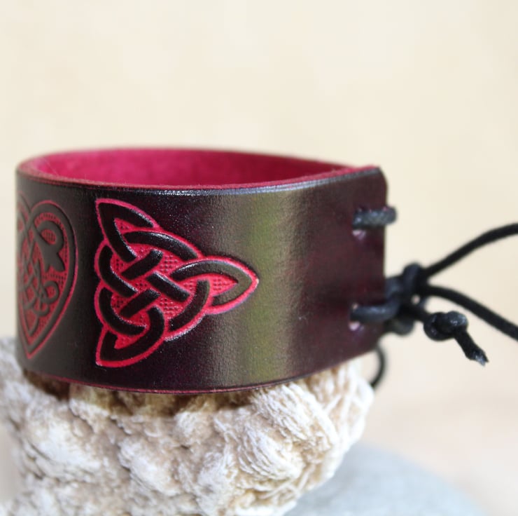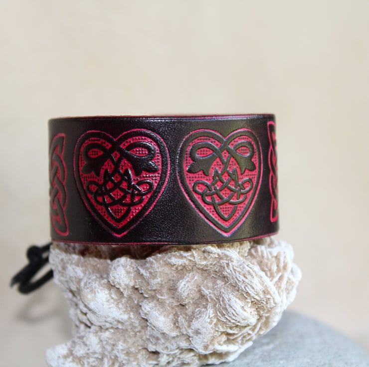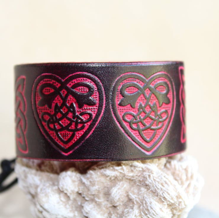 Hand crafted leather bracelet cuff for men and women with an embossed celtic heart and knot design.