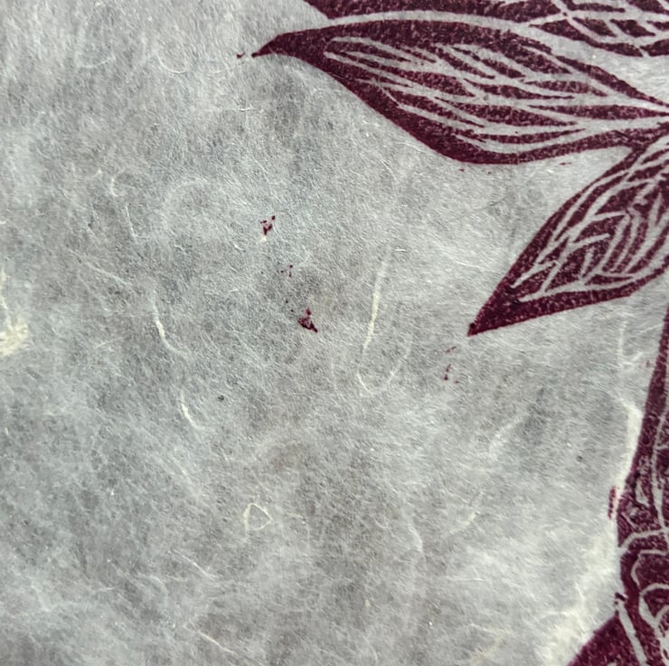 I've listed this original linocut as a second because the ink isn't evenly printed on one of the leaves and there are a few small inky markings which meant this print didn't make the edition. Other than that, it looks lovely and you might even enjoy the extra handmade character this tiny quirk gives the piece! The print is made on beautiful handmade Himalayan paper, which has a gorgeous translucent quality where you can see all the natural fibres. It also features a deckled edge. The print measures approximately 19 x 23 cm at its widest points.
