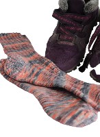 These hand knitted socks have been made using my hand-dyed yarn. They are an unusual mix of grey and coral, which is why I have called them 'peachy'.