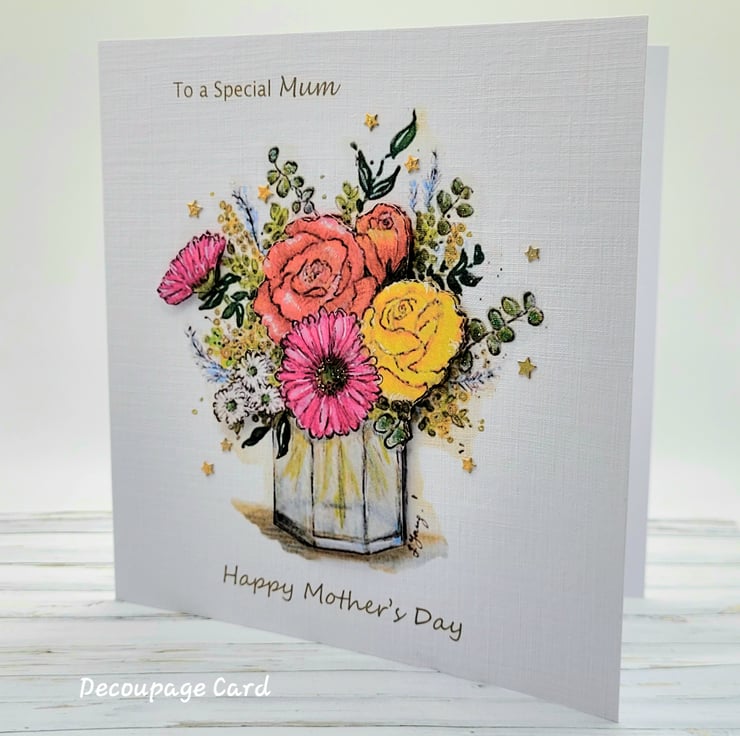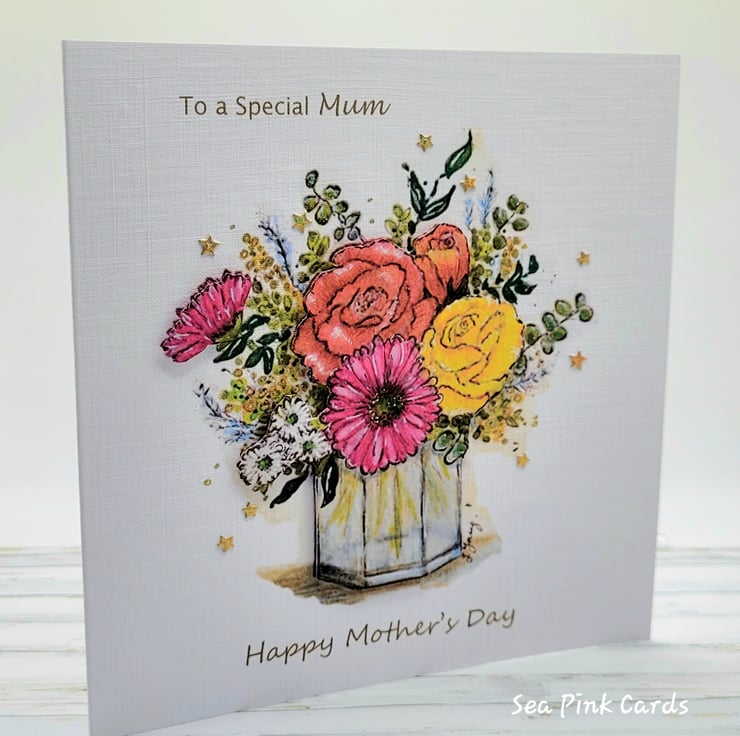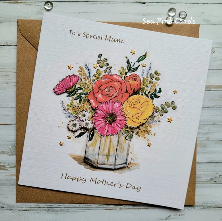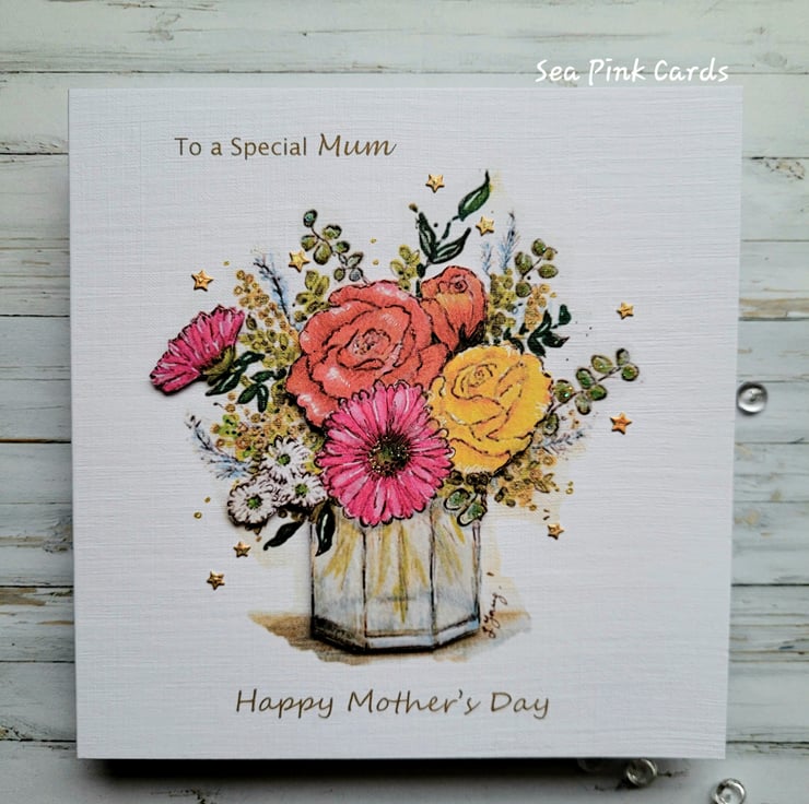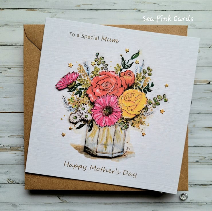 A beautiful mother's day card for a special mum, with a jam jar full of flowers and sprigs from the garden. Reproduced from my original colour drawing, I have given the card 3D dimension by decoupaging the flowers and jar and adding several little gold stars too. Further hand-finished with subtle sparkle pen, gold metallic pen and tiny touches of non-shedding glitter glue, which will sparkle when the card catches the light. This card for Mum measures 14.5 x 14.5 cms and comes with a 100% recycled brown kraft paper envelope. The inside is blank for writing your own personal greeting or message. The front has the sentiment, .... to a special Mum... Happy Mother's Day.