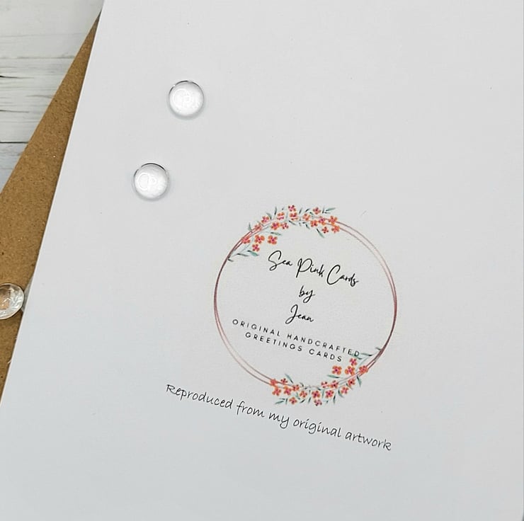 A unique and special card featuring my original artwork, with dimension and a lightly handcut textured linen card base. The back of the card has my own Sea Pink Cards logo. Delivery is by Royal Mail in a clear wrapper and a brown recyclable board-backed envelope.