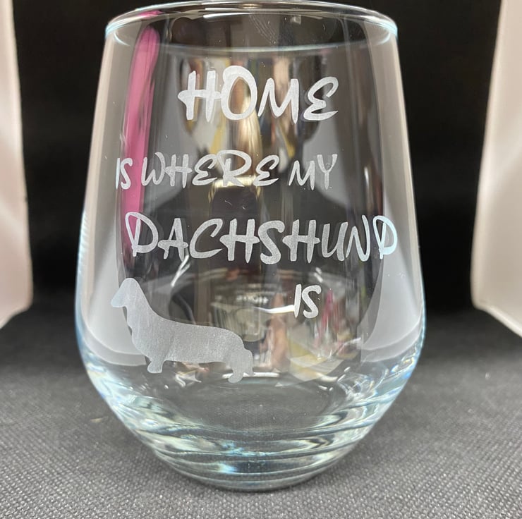 Hand Etched Wine Glass, Home is where my Dachshund is