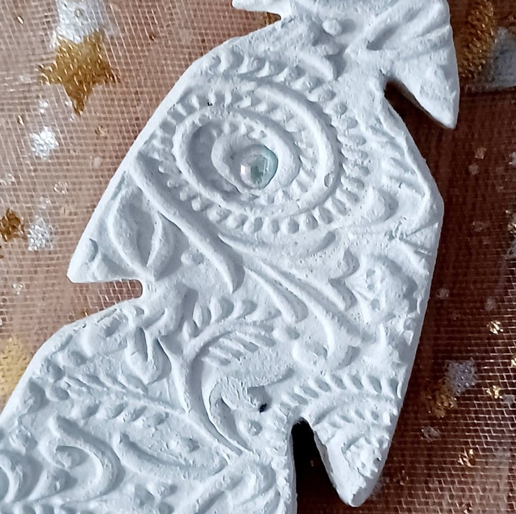 This pretty white feather hanging has a beautiful embossed pattern and also an angel aura bead placed within (they symbolise joy, peace and encourages hope and happiness).