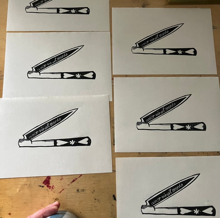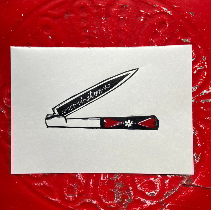 A two colour linocut print of a dagger with the Latin phrase Amor Vincit Omnia ( Love Conquers All) carved onto the blade.