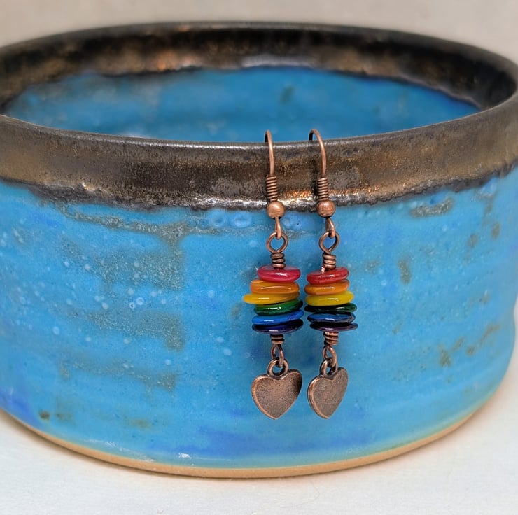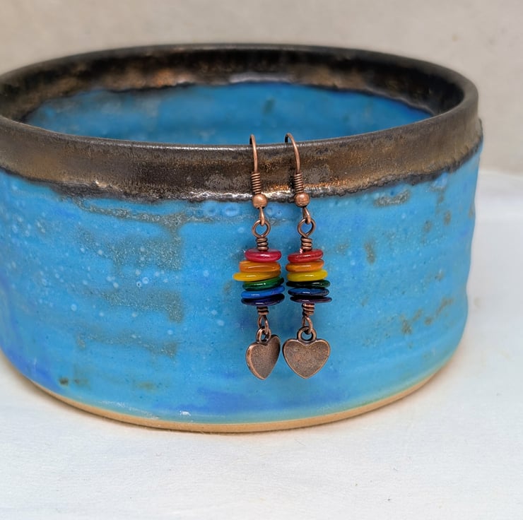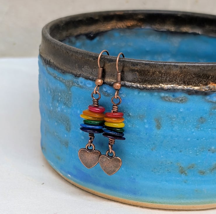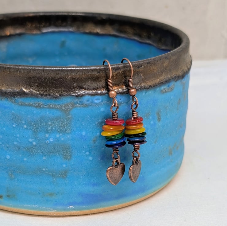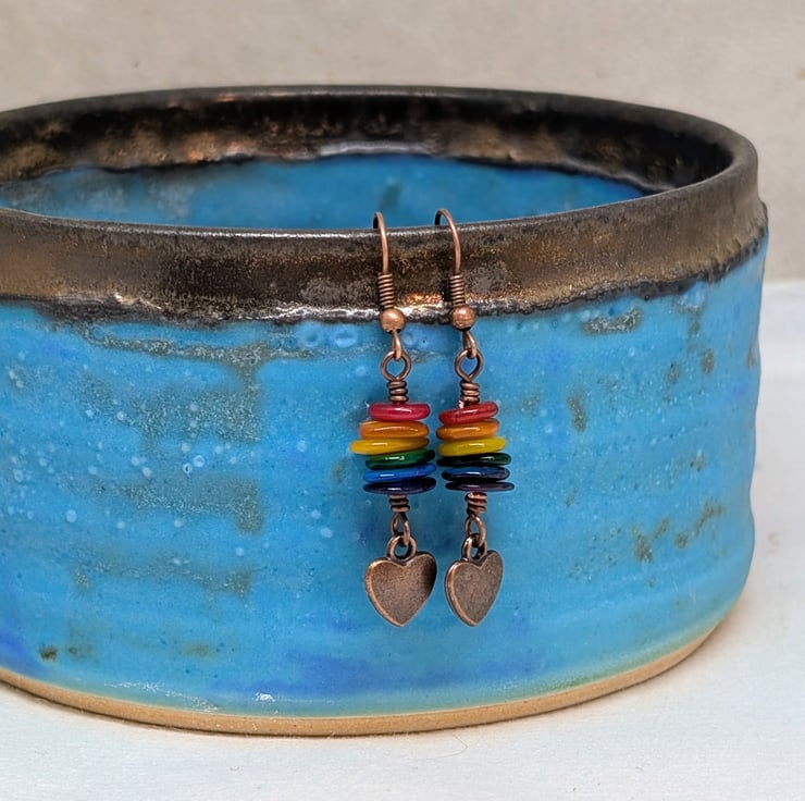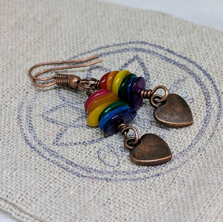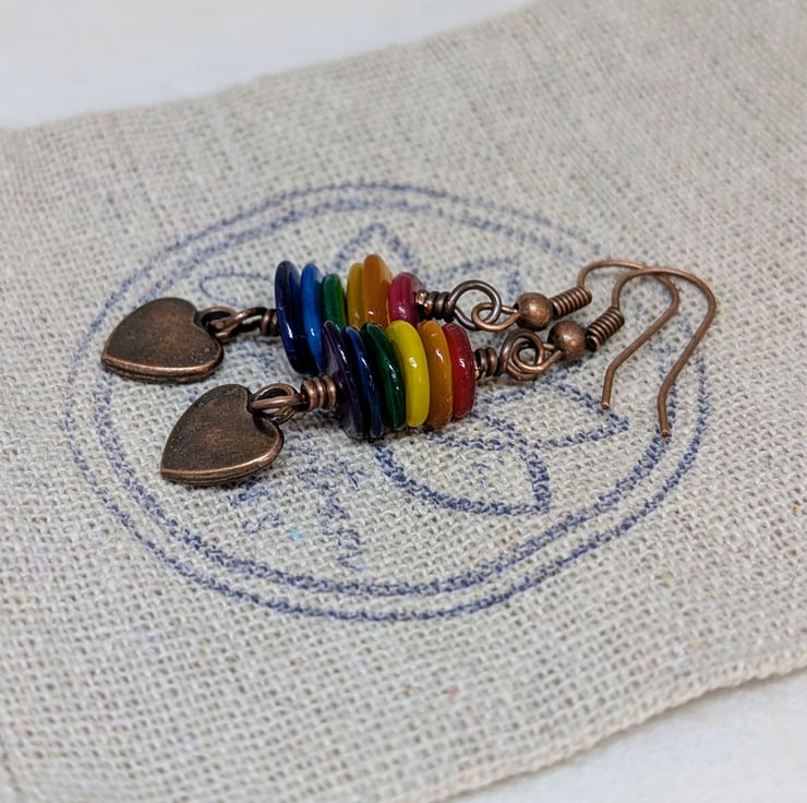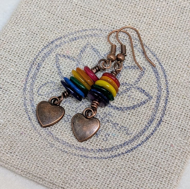 These cheerful earrings feature a mini stack of mother of pearl chips in a mix of rainbow colours. Beneath them hangs a cute copper charm, with everything attached to copper ear wires.