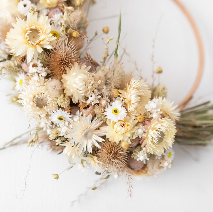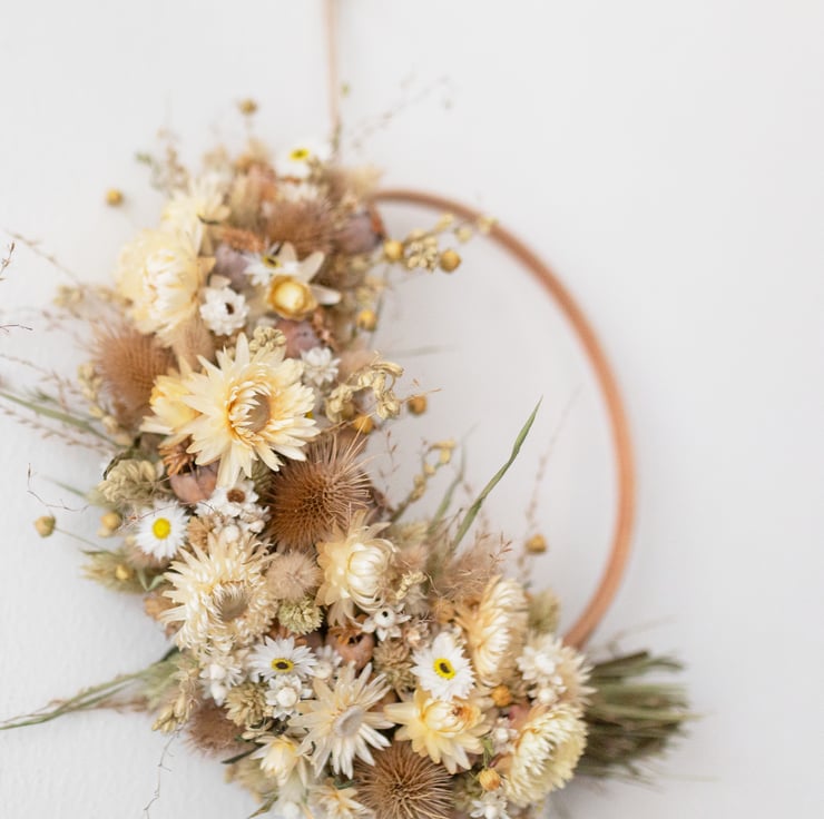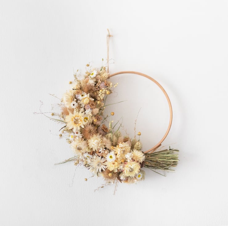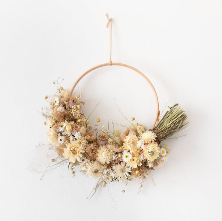 The wreath hoop base measures approx. 20cm, with dried flowers approx. 27cm