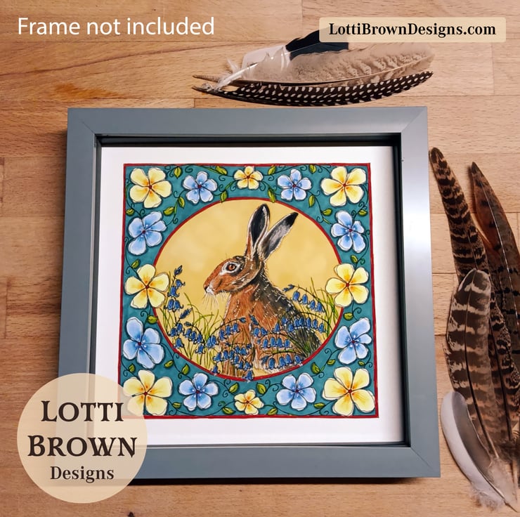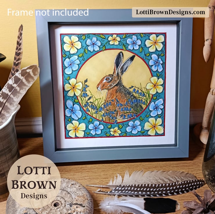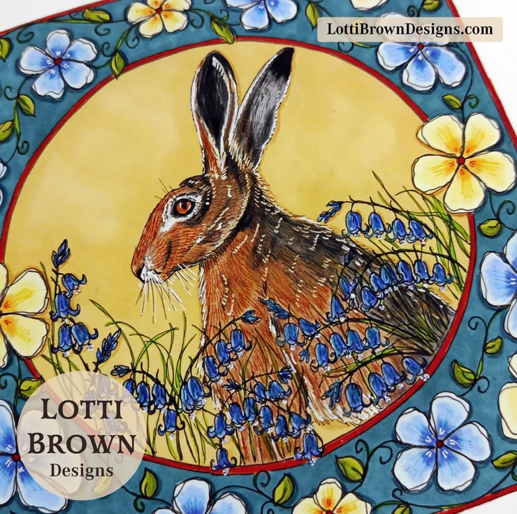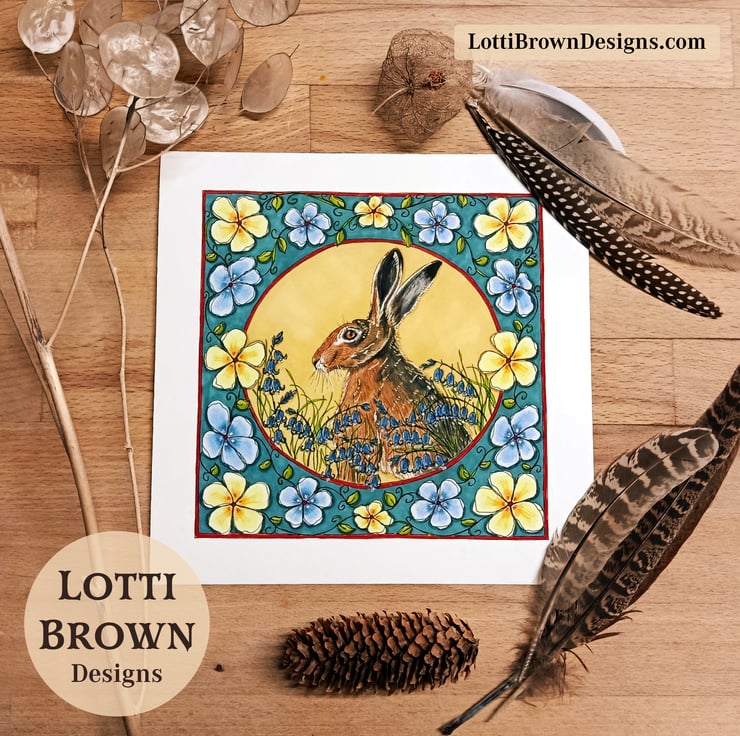 This artwork is inspired by the brown hares we have in our fields here in East Yorkshire - and specifically the folklore around the magical moon and the hare. I was once lucky enough to glimpse a small group of hares sat in the field all gazing skywards towards the moon!