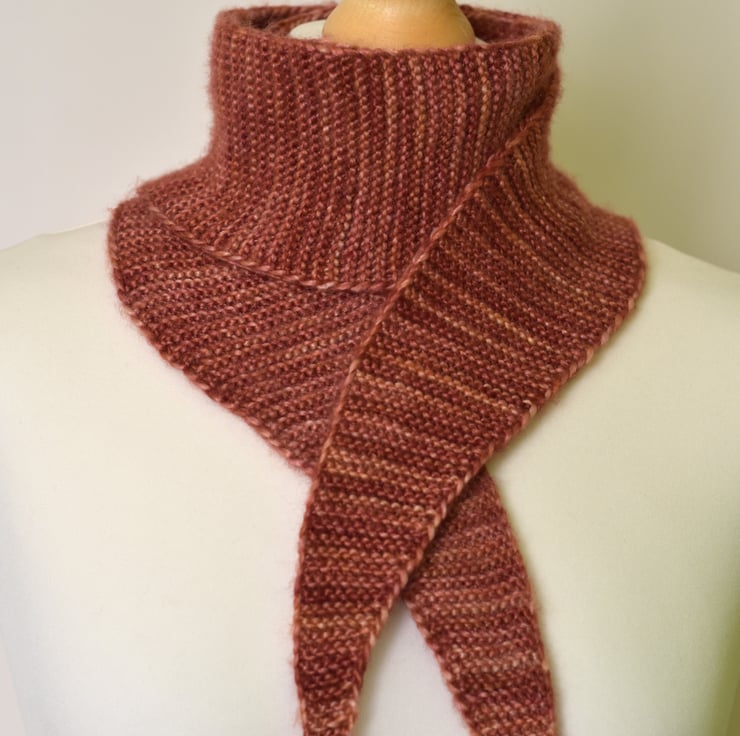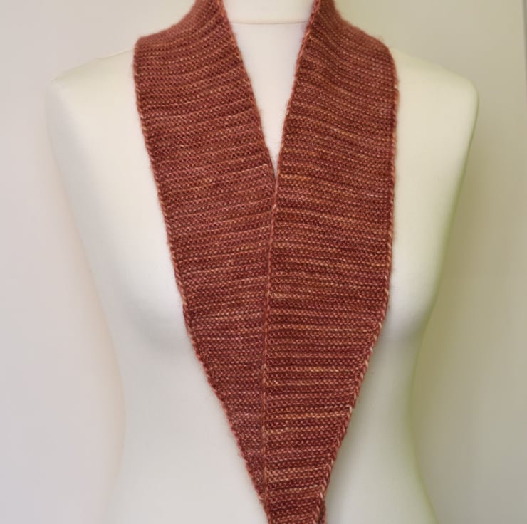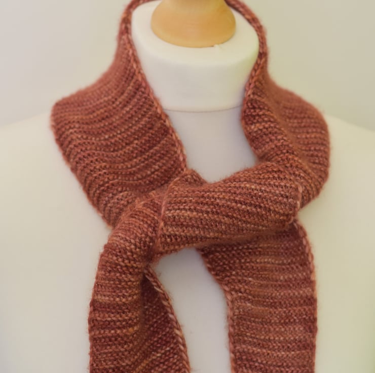 A beautifully soft and lightweight handmade scarflette, knitted from luxurious yarn - a blend of 51% silk and 49% merino wool. Carefully kettle-dyed in small batches, creating a beautiful terracotta tone.