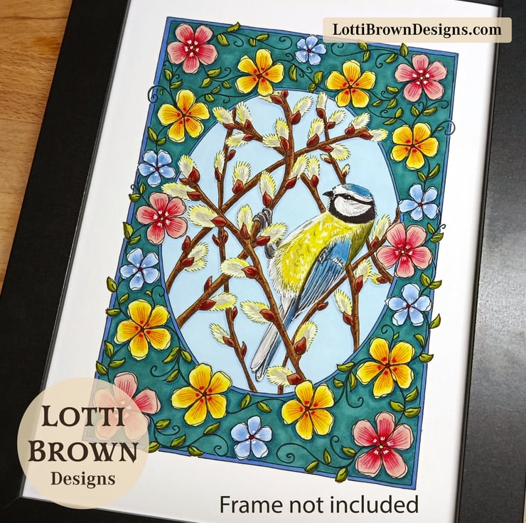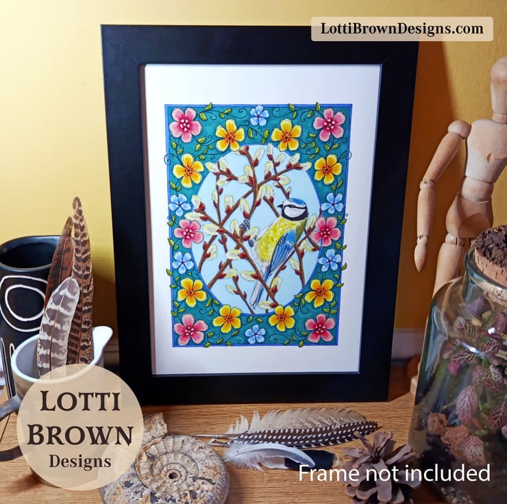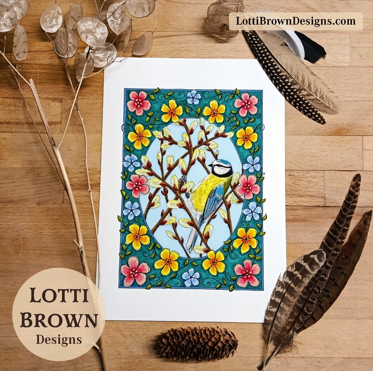 A little flash of blue and yellow, the blue tit brings joy, movement, and brightness wherever it appears. This hand-drawn artwork was inspired by watching blue tits flitting through winter branches and spring catkins, full of energy and curiosity.