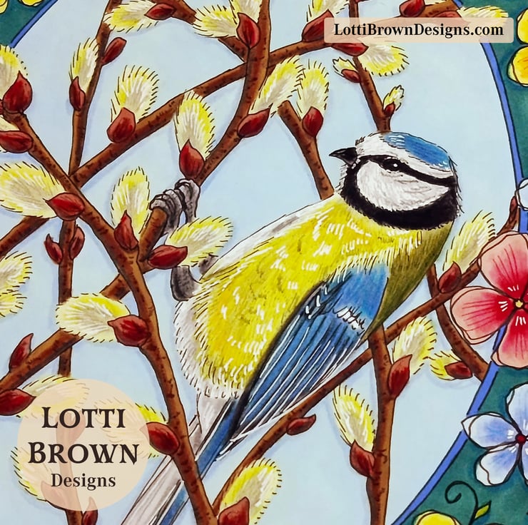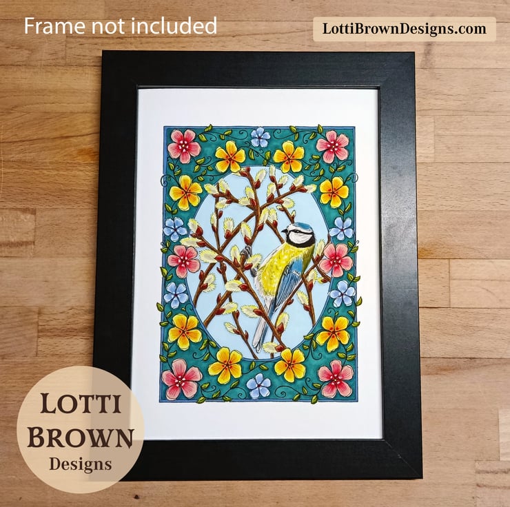 This artwork is inspired by beautiful little blue tits that I see in the trees of my garden all year round, but especially in Spring. It's lovely to watch their amazing acrobatics and we've been honoured that the blue tits have brought their babies to our feeders to learn to feed - that was lovely to see!