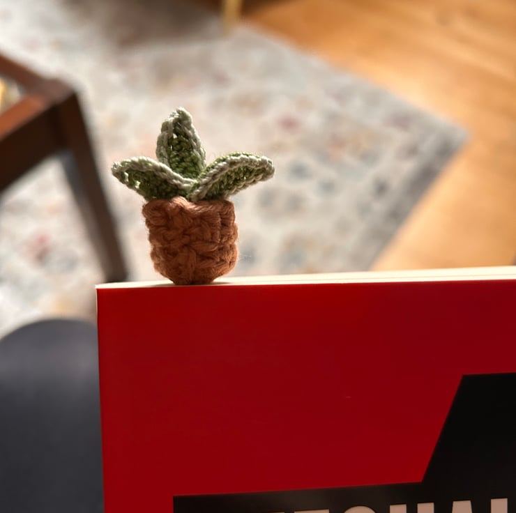 The perfect accessory for the plant loving book worm. A crocheted bookmark to hold your place, featuring a tiny plant pot that peeks over the top your book.